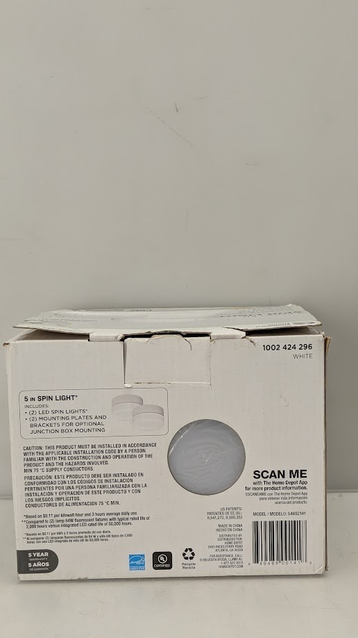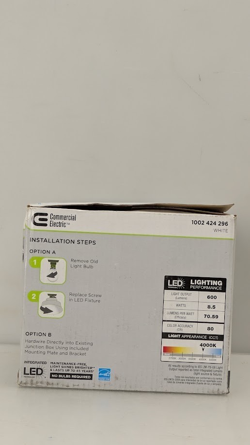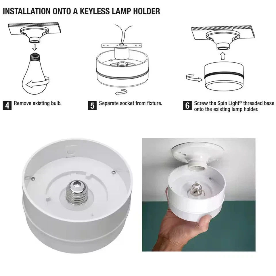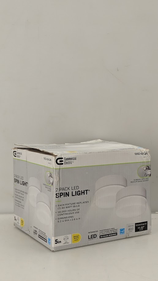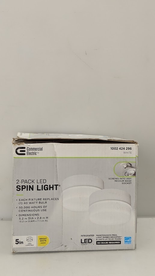 Commercial Electric 5in. Spin Light Integrated LED Flush Mount Ceiling Light converts a bare lamp holder into an energy-efficient LED fixture. Simply screw the Spin Light into existing plastic and/or porcelain lamp holder - Just like a light bulb! No wiring required. This fixture emits 600 Lumens of brightness using only 8.5-Watts of electricity saving the environment and your wallet. With its long-lasting light engine, this Spin Light is maintenance free with no bulbs required. Great for closets, garage, pantry, laundry room, hallway, stairway and landing, basement, or other dark areas.
