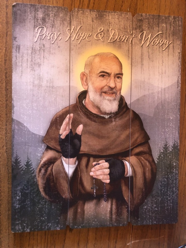 Your purchase is for a beautiful colored image of Saint Padre Pio set on a wood pallet. Bring this beautiful image to your home as a reminder on how powerful this saint is. First priest to ever have a stigmata. He had a profound devotion to the rosary meditations, and many more attributes. The image has the following word on top: "Pray, Hope Don't Worry"
