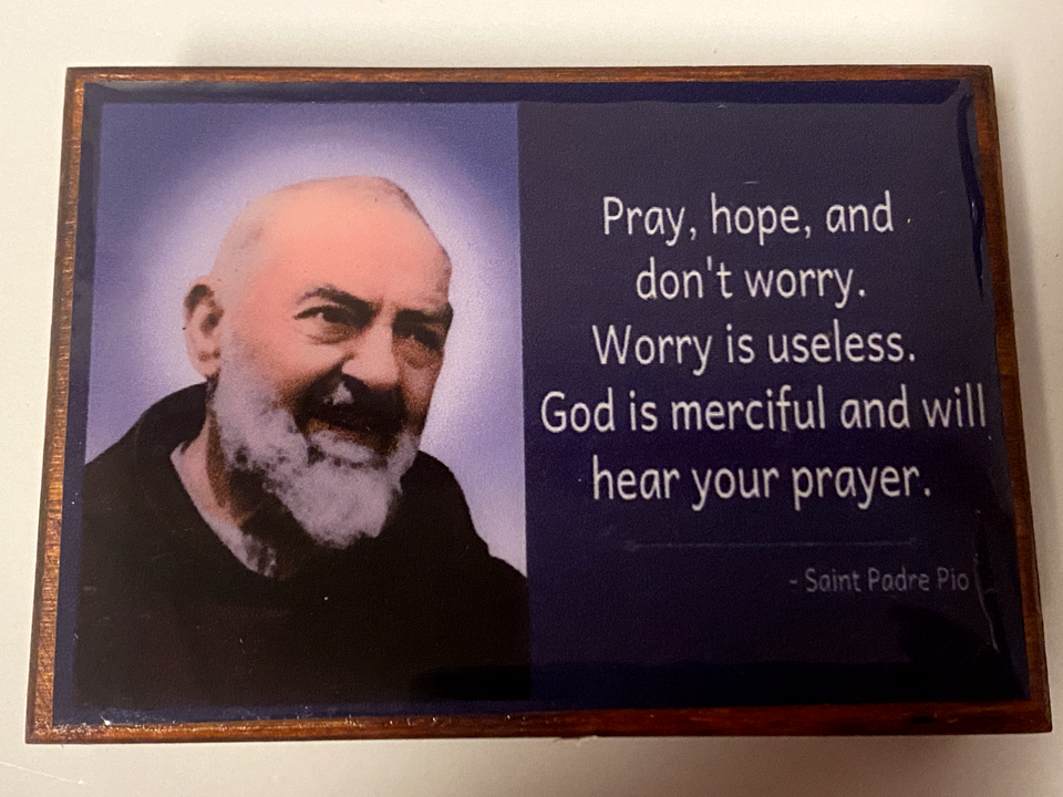 You are purchasing a beautiful wood rosary box with an acrylic image of Padre Pio on top. It comes with a wood rosary with the medal of Saint Benedict.