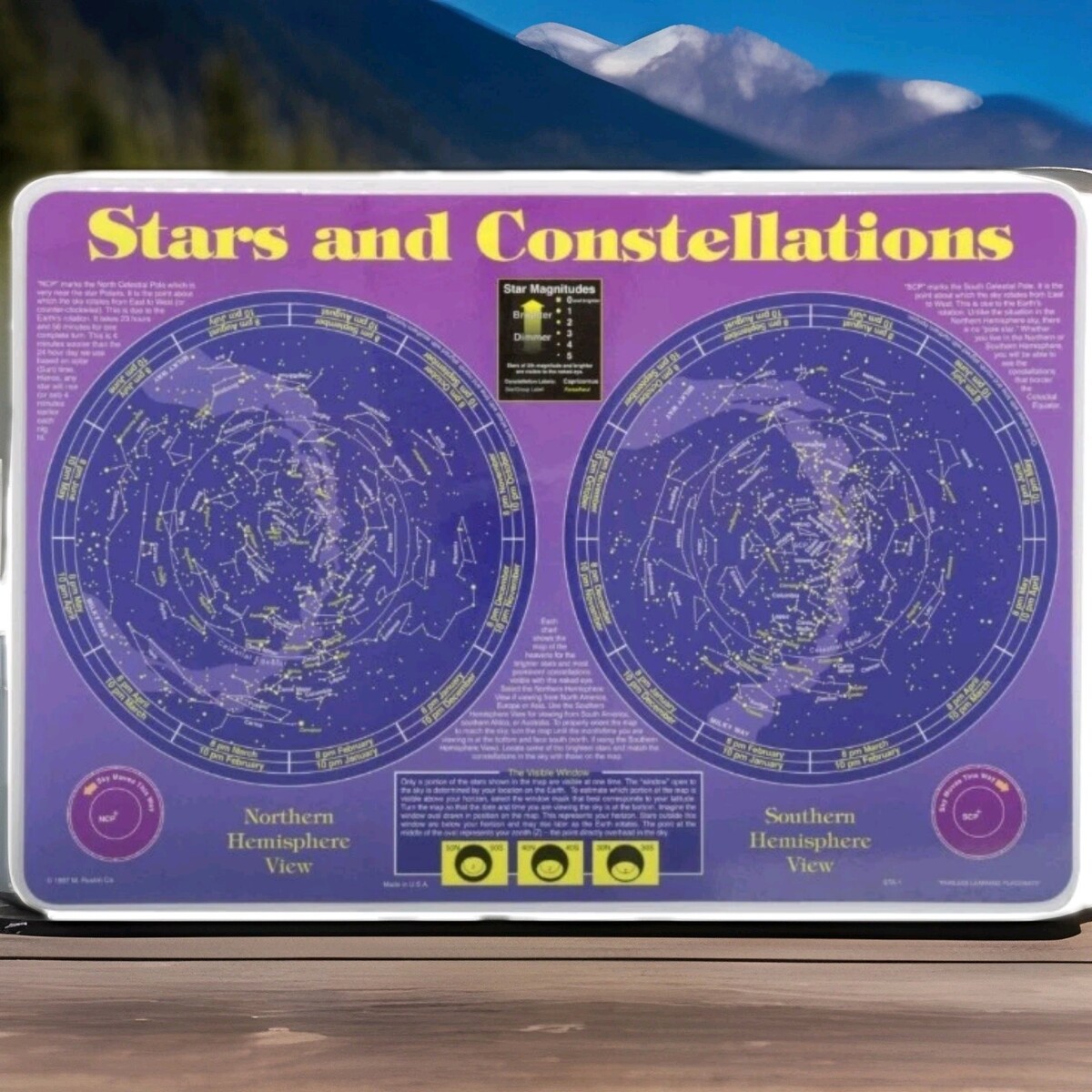 The Painless Learning Stars Constellations Purple Placemat is a large, beautifully designed placemat that features a vibrant purple color and intricate star and constellation patterns.