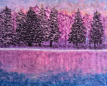 This stunning original painting by Carla Dancey captures the beauty of a sunset reflecting on a river, featuring shades of mauve, purple, orange, and pink on blue water. The landscape is painted in the style of Bob Ross, with impressionistic evergreen trees and nature. Measuring 14 inches in width and 11 inches in height, the artwork is hand-painted with acrylic on canvas board and signed by the artist.