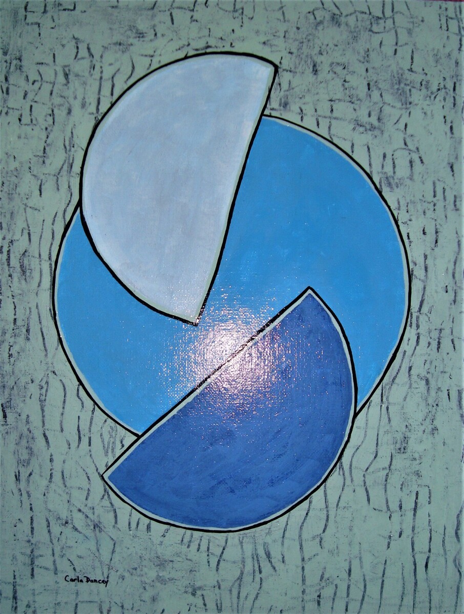 This original painting titled "Orb and Two Halves" is a stunning piece of contemporary art created by Canadian artist Carla Dancey. The painting features abstract geometric shapes in multi-colors, including circles or a moon, with a copper patina finish. Measuring 11 inches in width and 14 inches in height, this medium-sized canvas board painting is perfect for any modern home or office space.