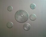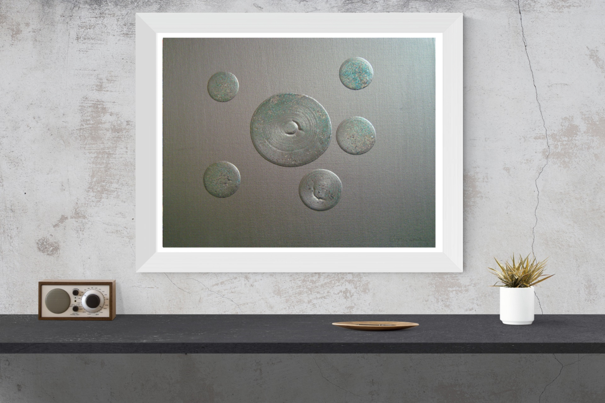 'Blue Steel Saucers' by Carla Dancey. This is an original mixed media acrylic and glitter painting on an 11" x 14" strong, durable, child and pet friendly canvas board. The background is a metallic silver color. The artwork has two coats of high gloss protective varnish for long lasting protection. The painting is titled and signed on the back as well as signed on the front lower right hand corner. It really looks great in the sunlight and would look good hung in any sunny location. Unframed but the painting comes with a hanger attached so you can hang it with or without a frame.