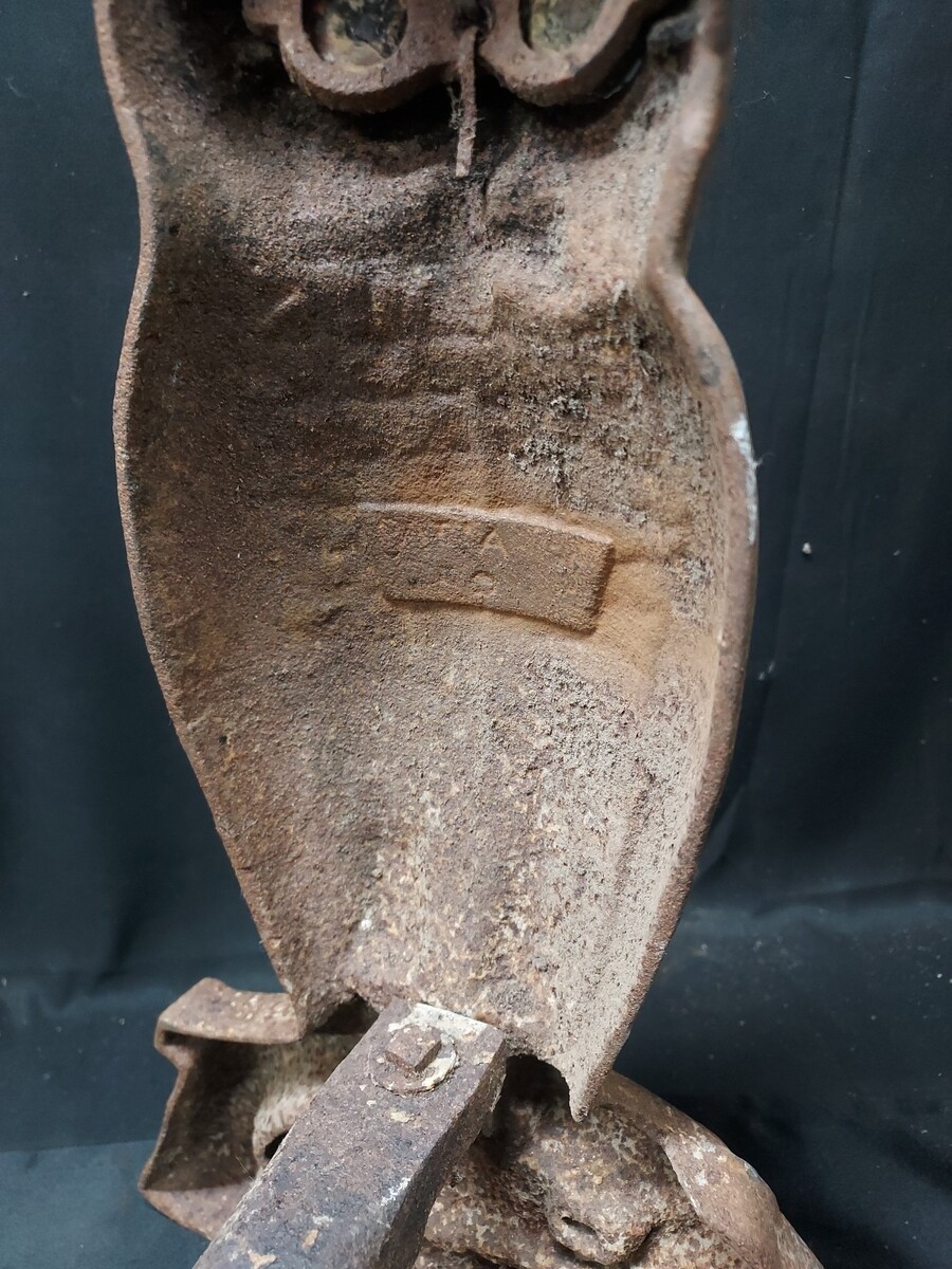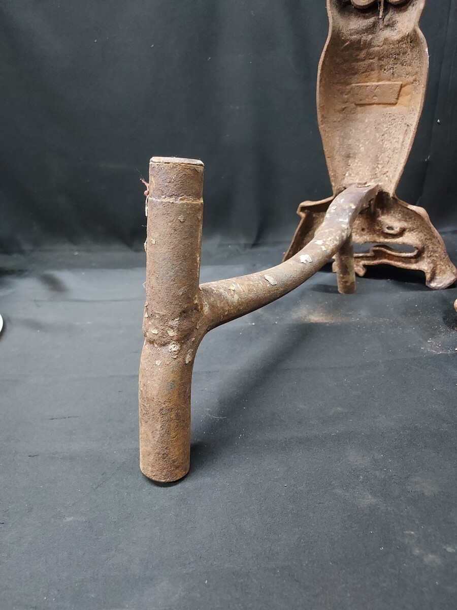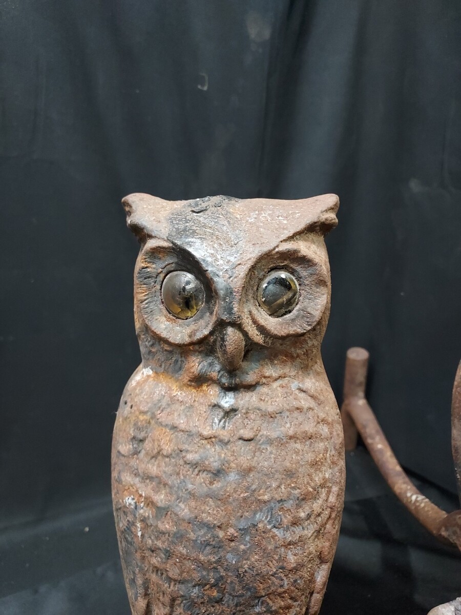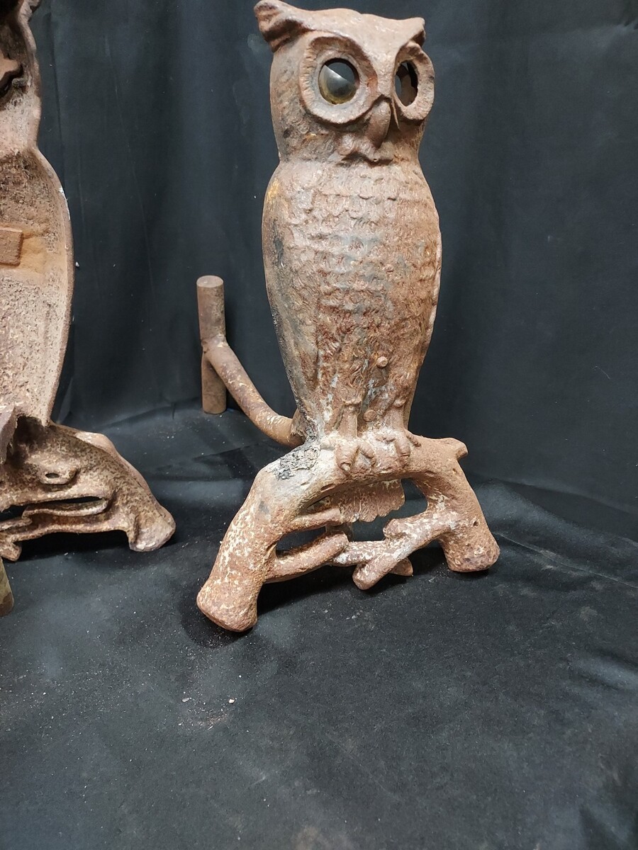 - Pair 1800s Antique Cast Iron Owl Andirons Glass Eyes Fireplace Log Holder