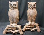 Pair 1800s Antique Cast Iron Owl Andirons Glass Eyes Fireplace Log Holder