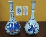 - Pair Bottle Vase 6"+ Hand Painted Blue Red Foo White Kangxi Leaf Mark Antique