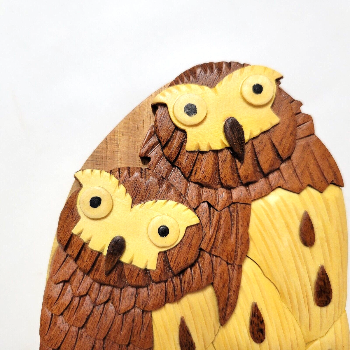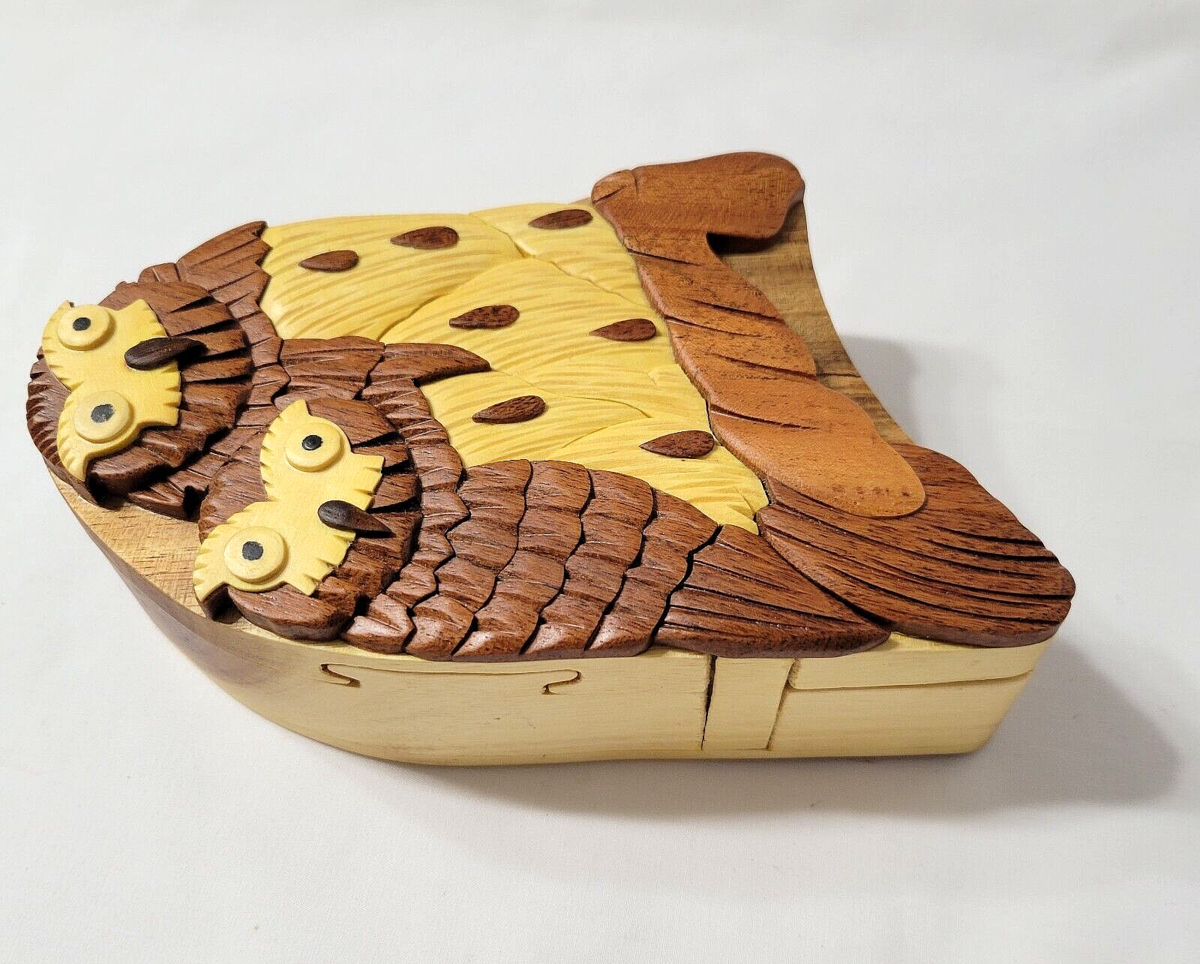 - Pair of Hoot Owls CARVER DANS Solid Wood Puzzle Trinket Box Lined Vietnam