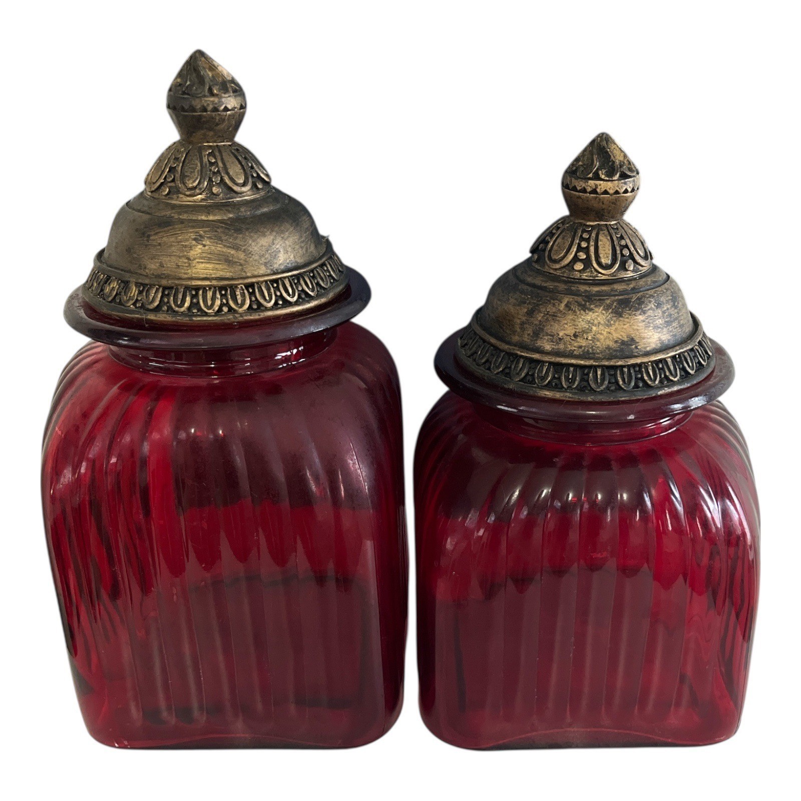 Beautiful pair of decorative ruby red glass jars with ribbed sides and ornate bronze-style lids. Each jar features a rich, deep red color and detailed metal-look finial tops with an antique patina. Perfect for display, vanity storage, or adding a touch of vintage-inspired elegance to any space.