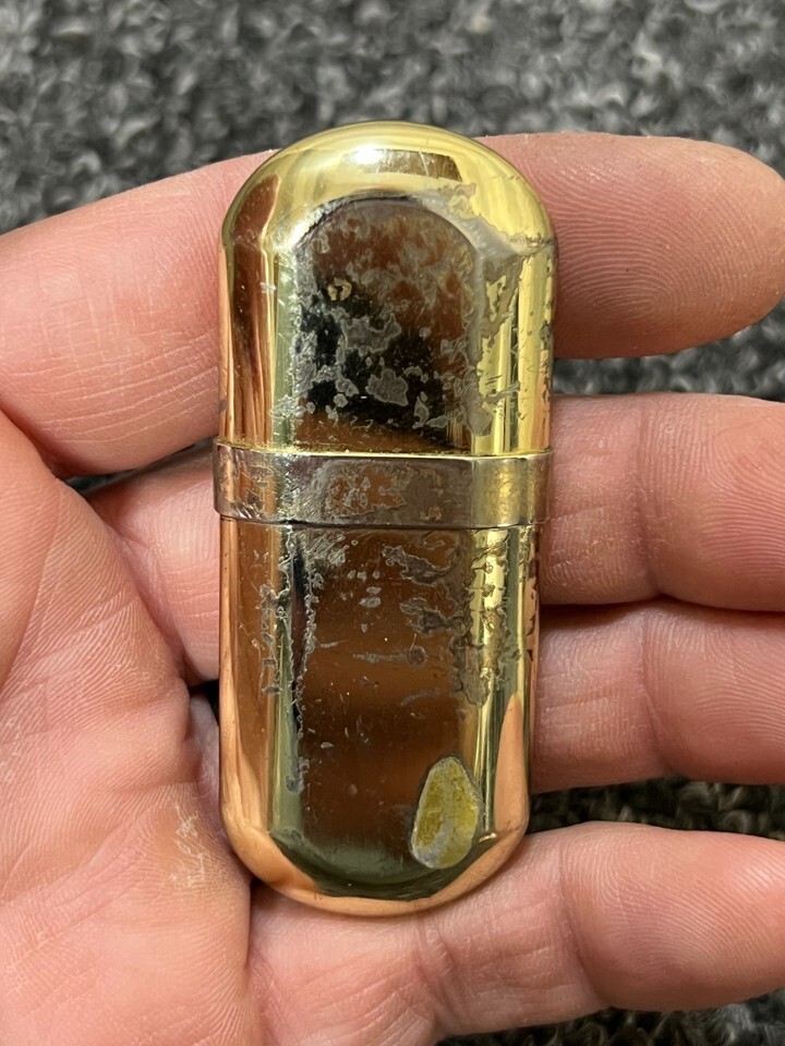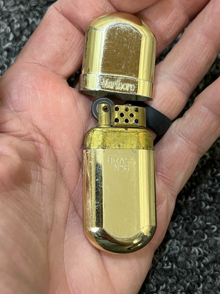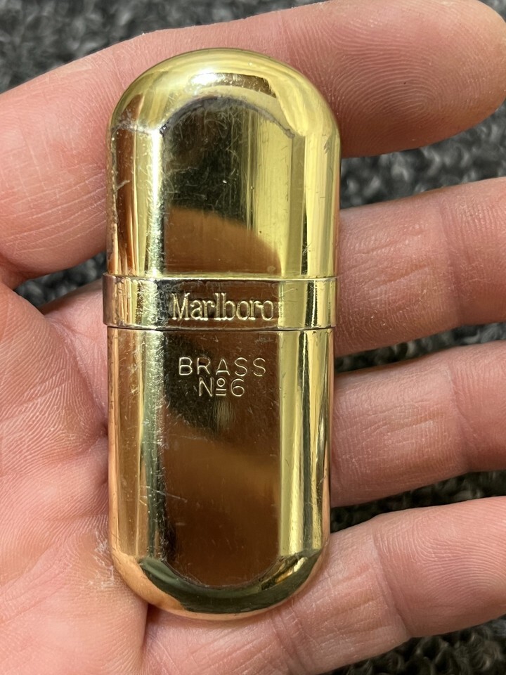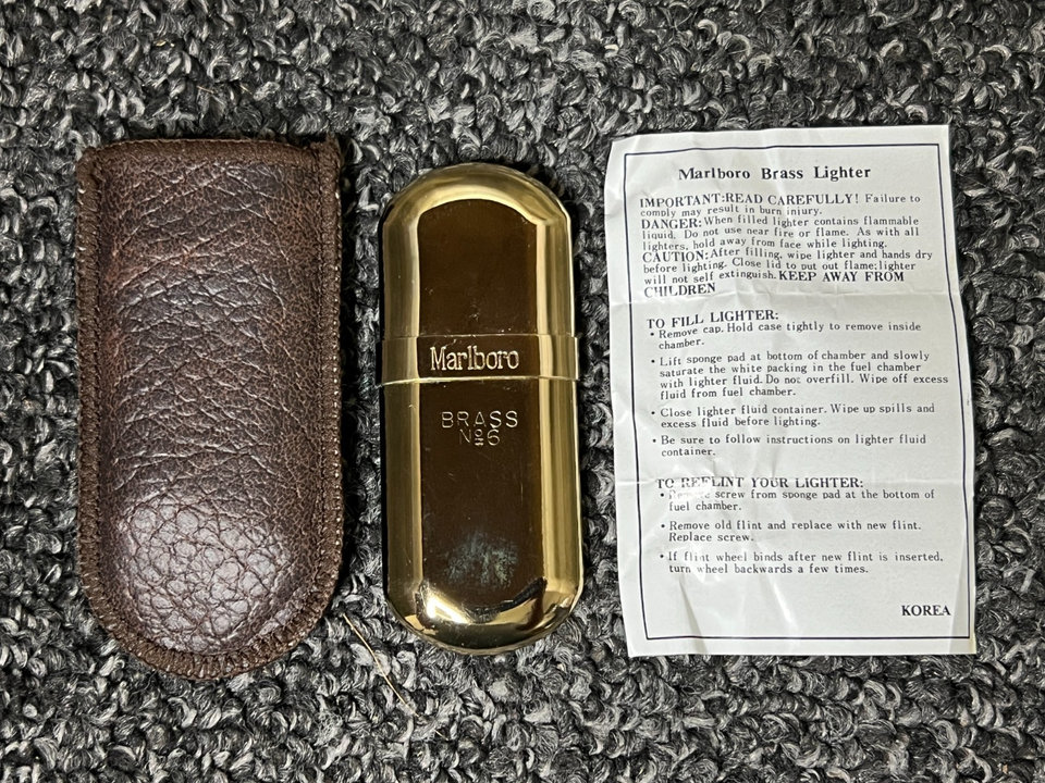 The item for sale is a pair of vintage Marlboro Brass No. 6 Lighters. One is in great used condition with minor age-related wear. The other is heavily worn. Each will need flints and fluid. Both come with pouches, and the nicer one comes with the original leaflet.