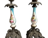 - Pair of antique French cast iron candle ormolu porcelain holders, tulips, blue