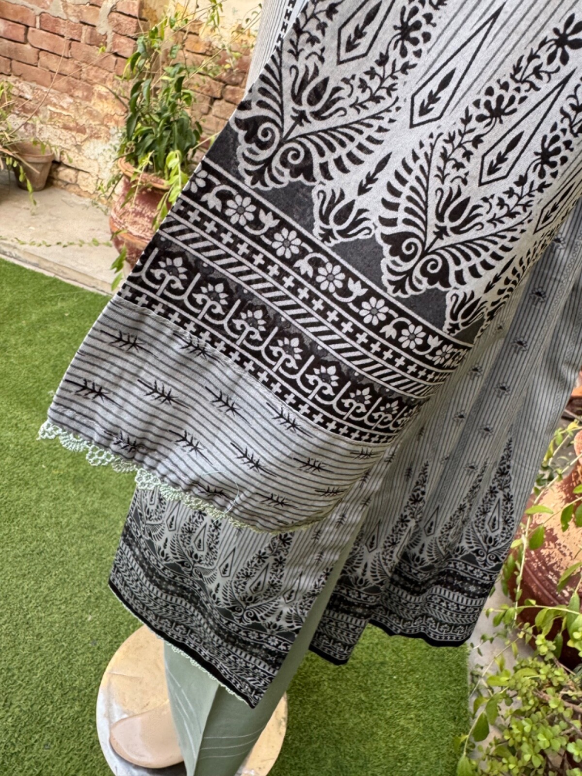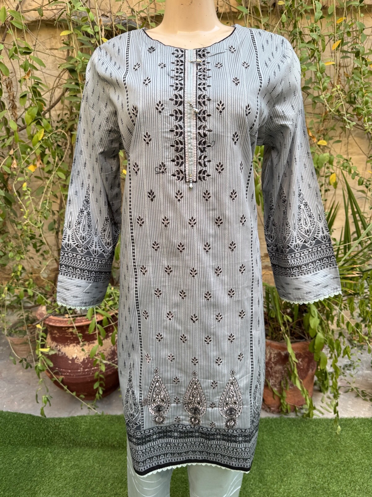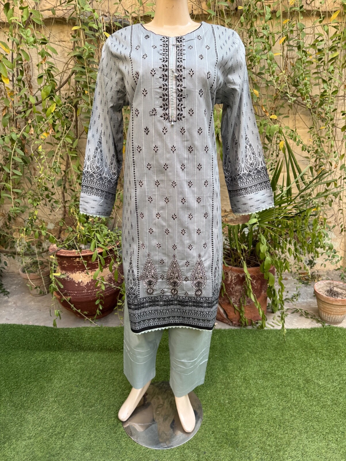 Pakistani Gray Printed Straight Shirt 3-PCS Lawn Suit w/ Threadwork ,XL#2