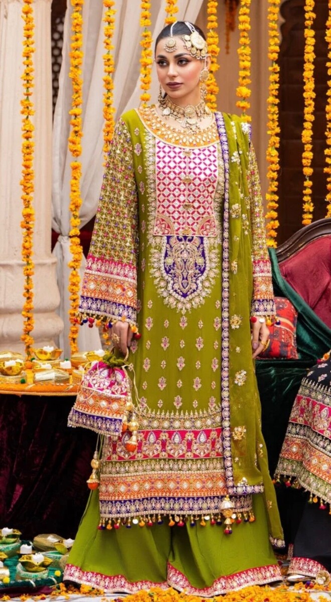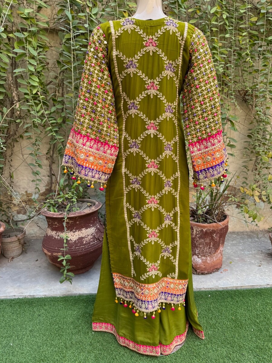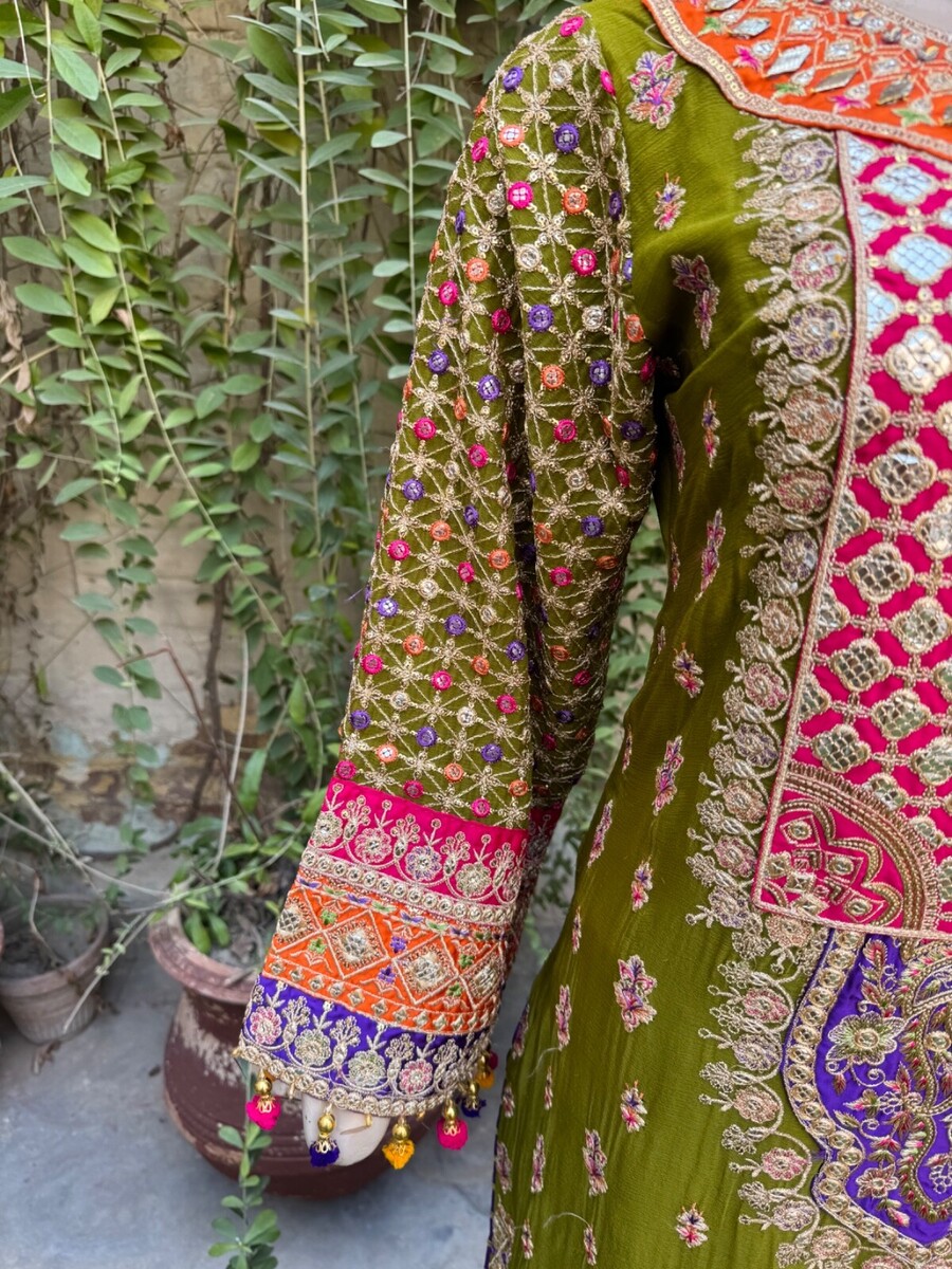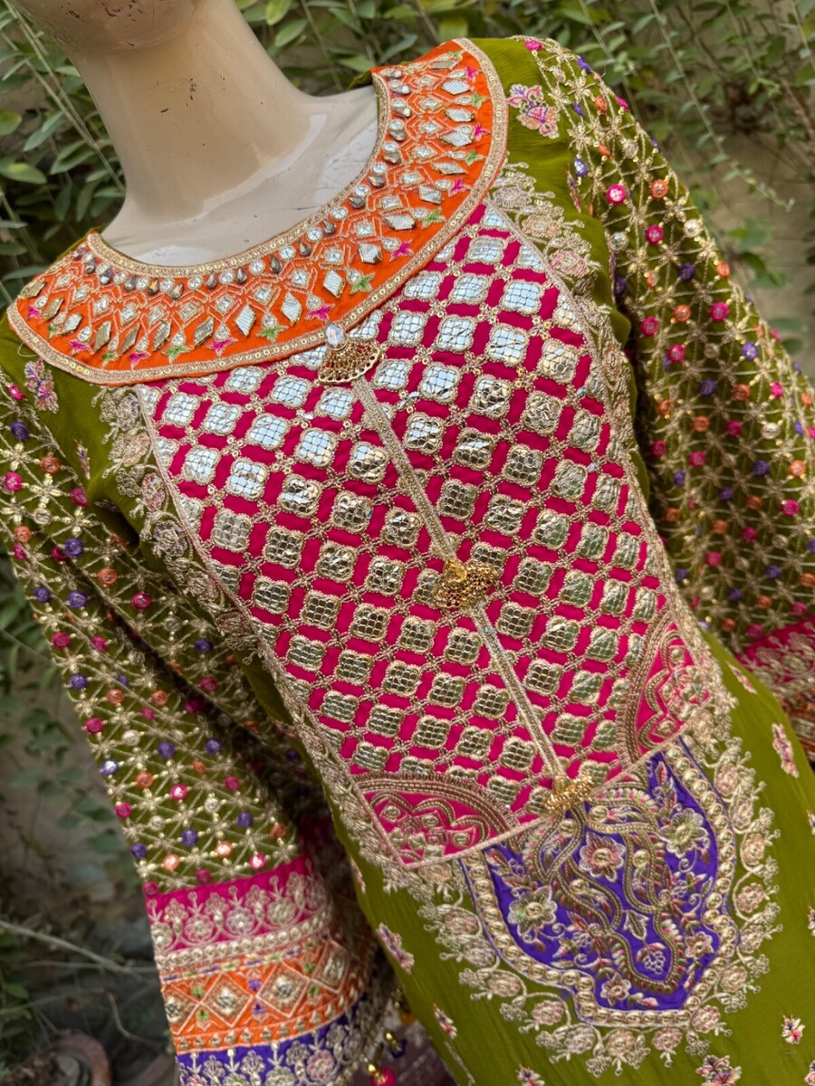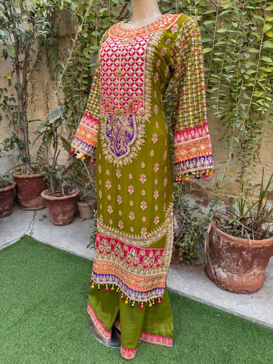 ? Mahendi Green raw silk sharara with light thread embroidery Sequins work.