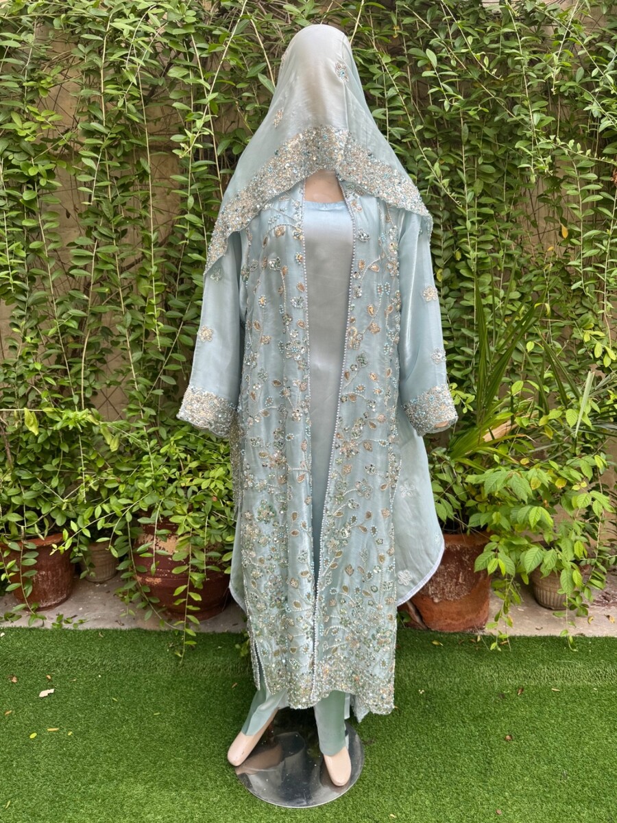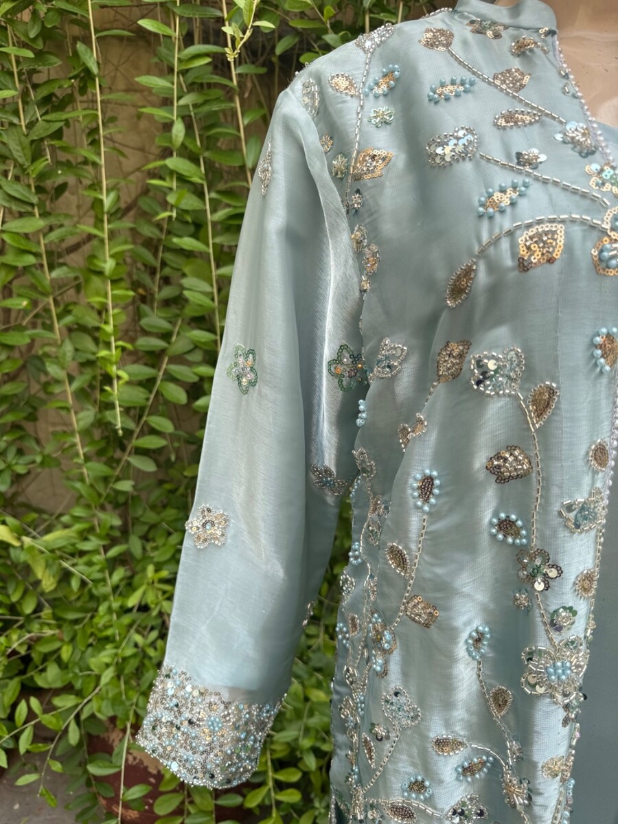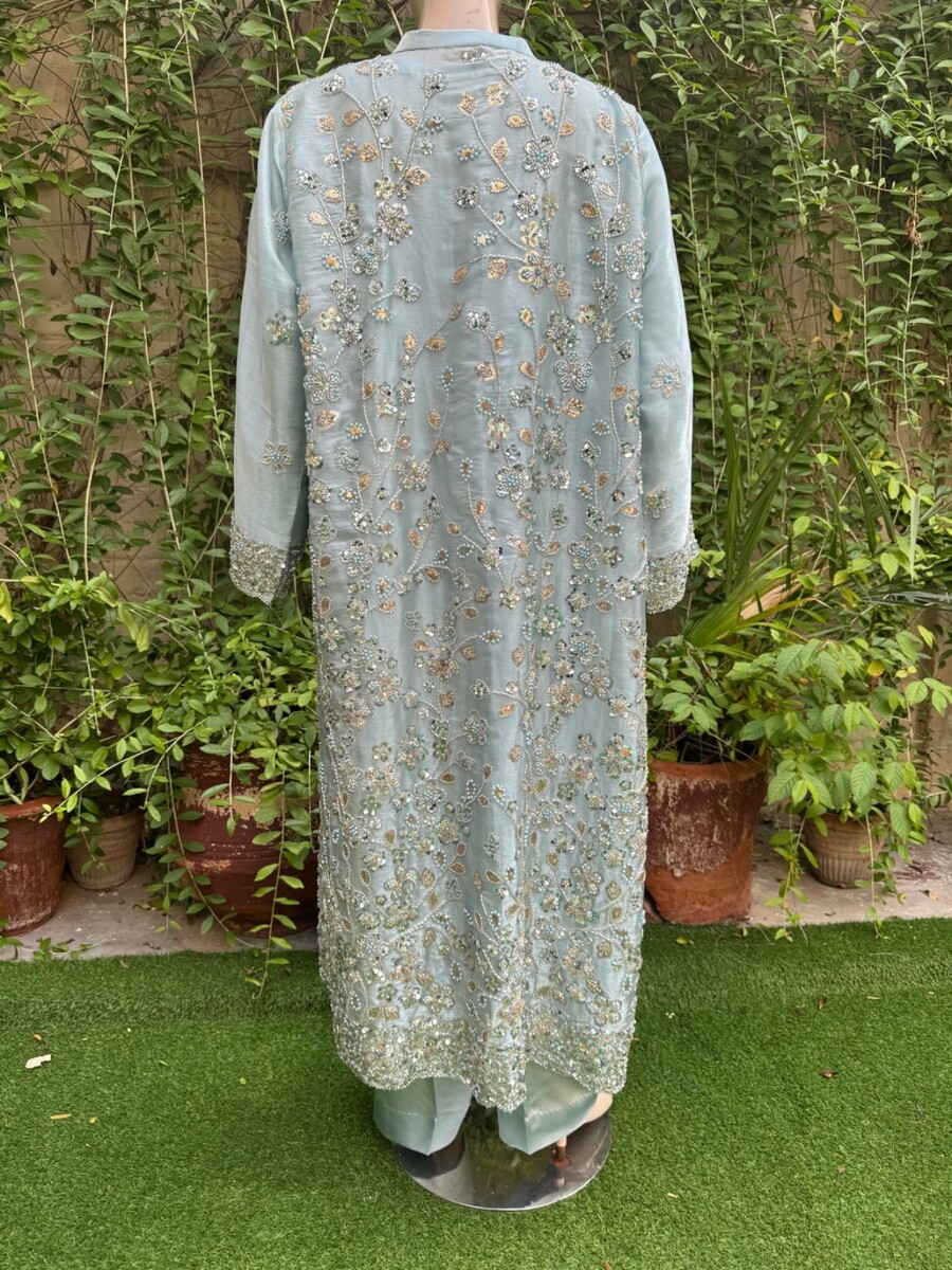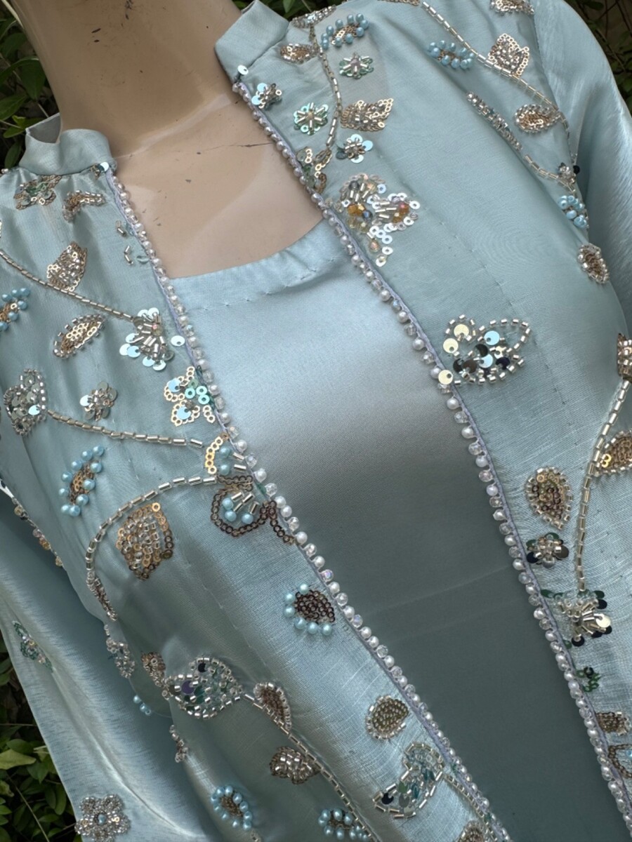 ? Ice Blue Russian silk embroidery and sequins (Cutdana work) work on long open gown, back is also full with cutdana work.