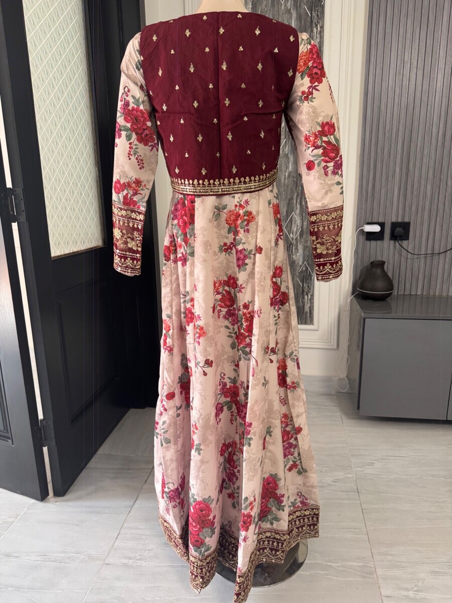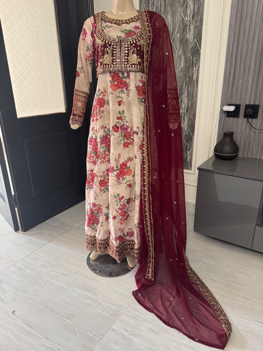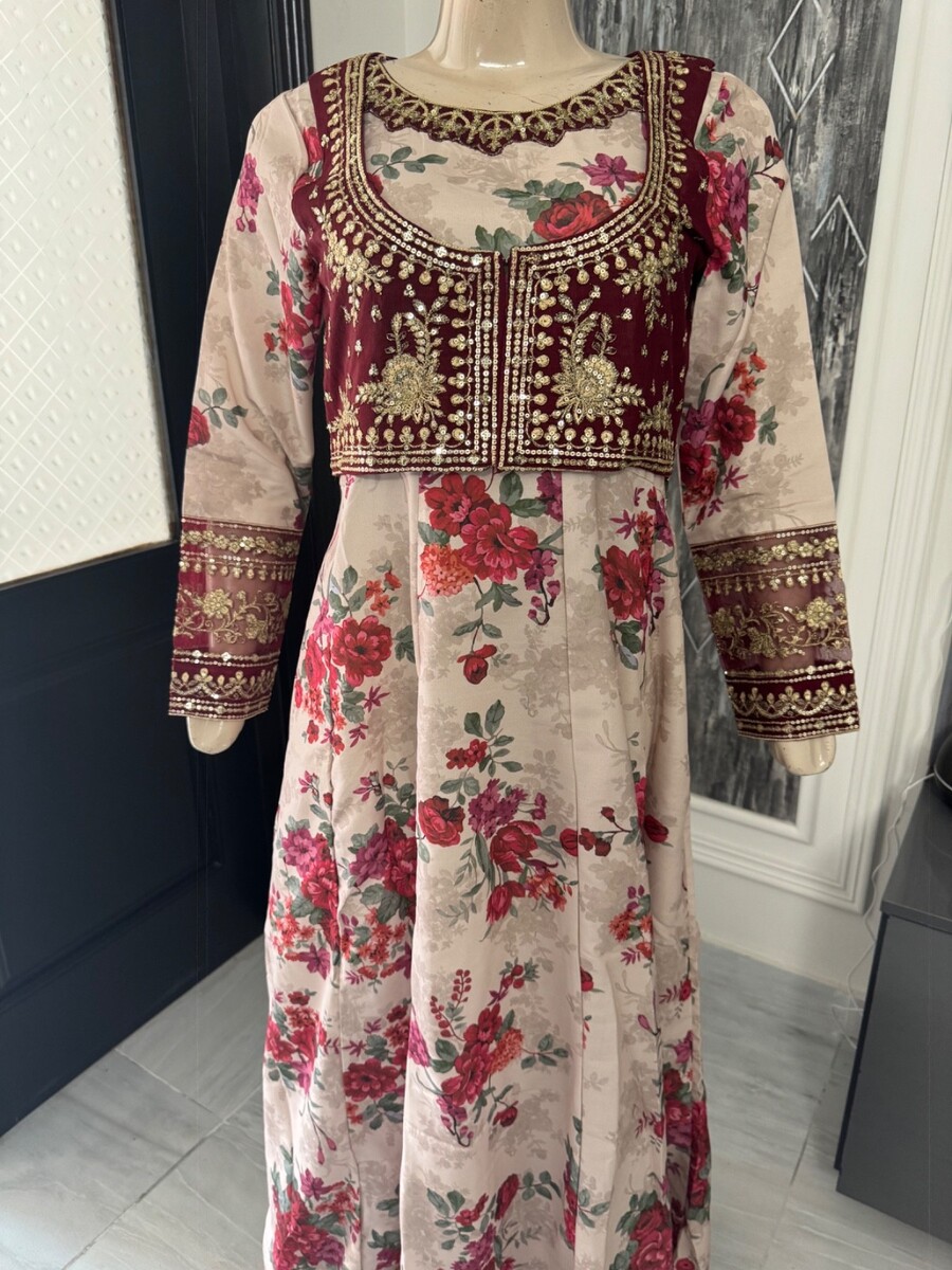 ? Light Beige printed katan silk long Maxi dress, boarder with fancy thread embroidery Sequins work, fancy thread embroidery Sequins work on arm,waist coat is full embroidered.