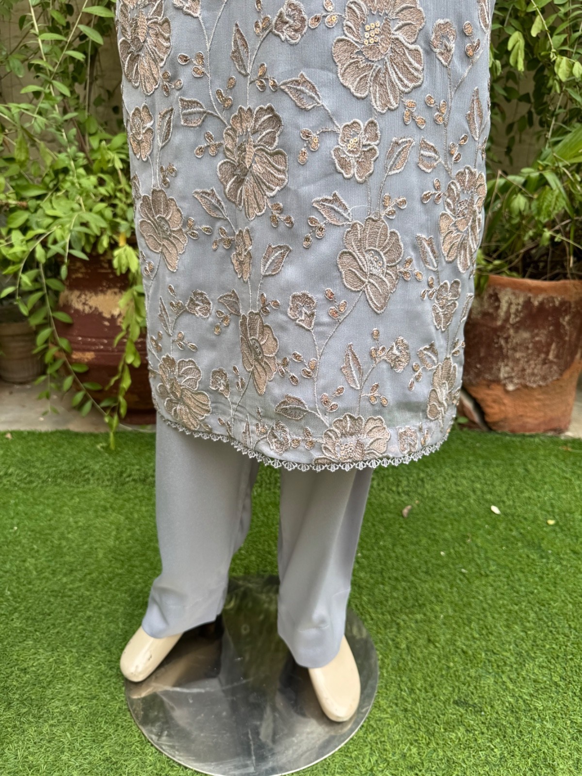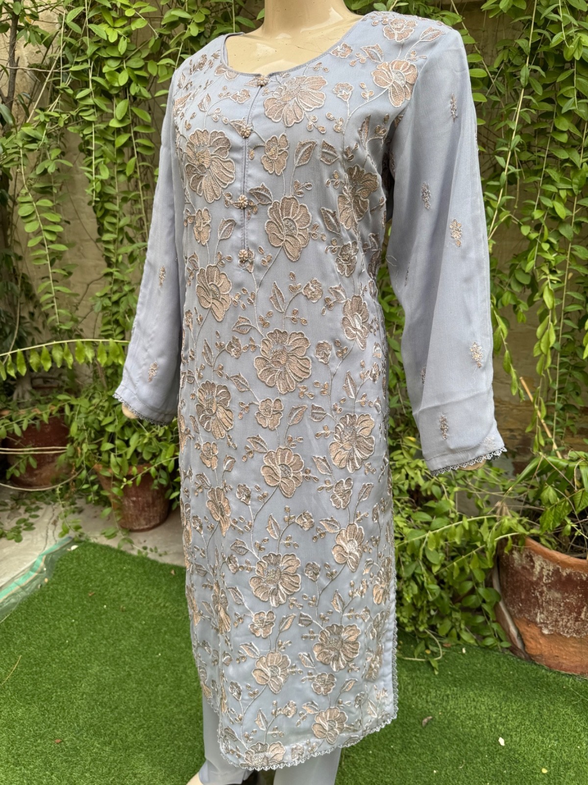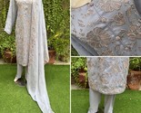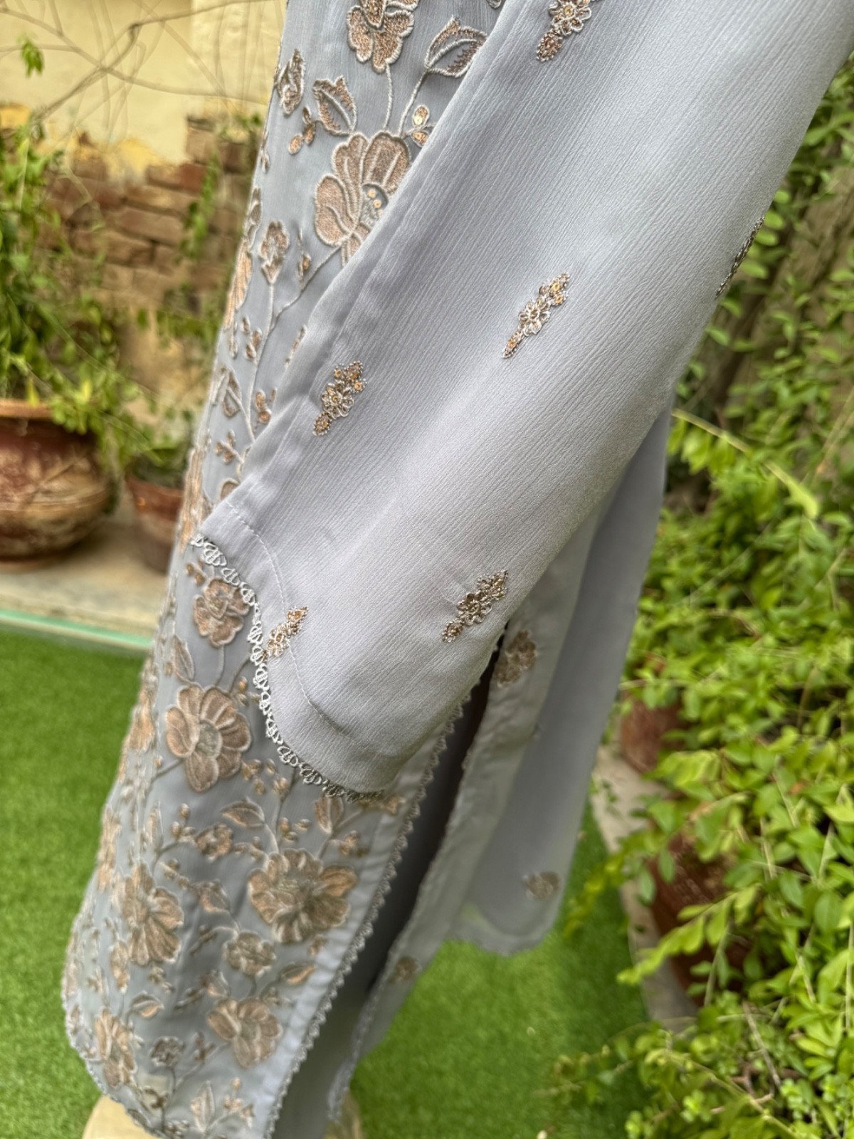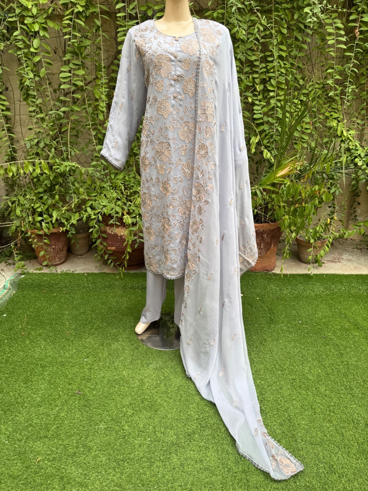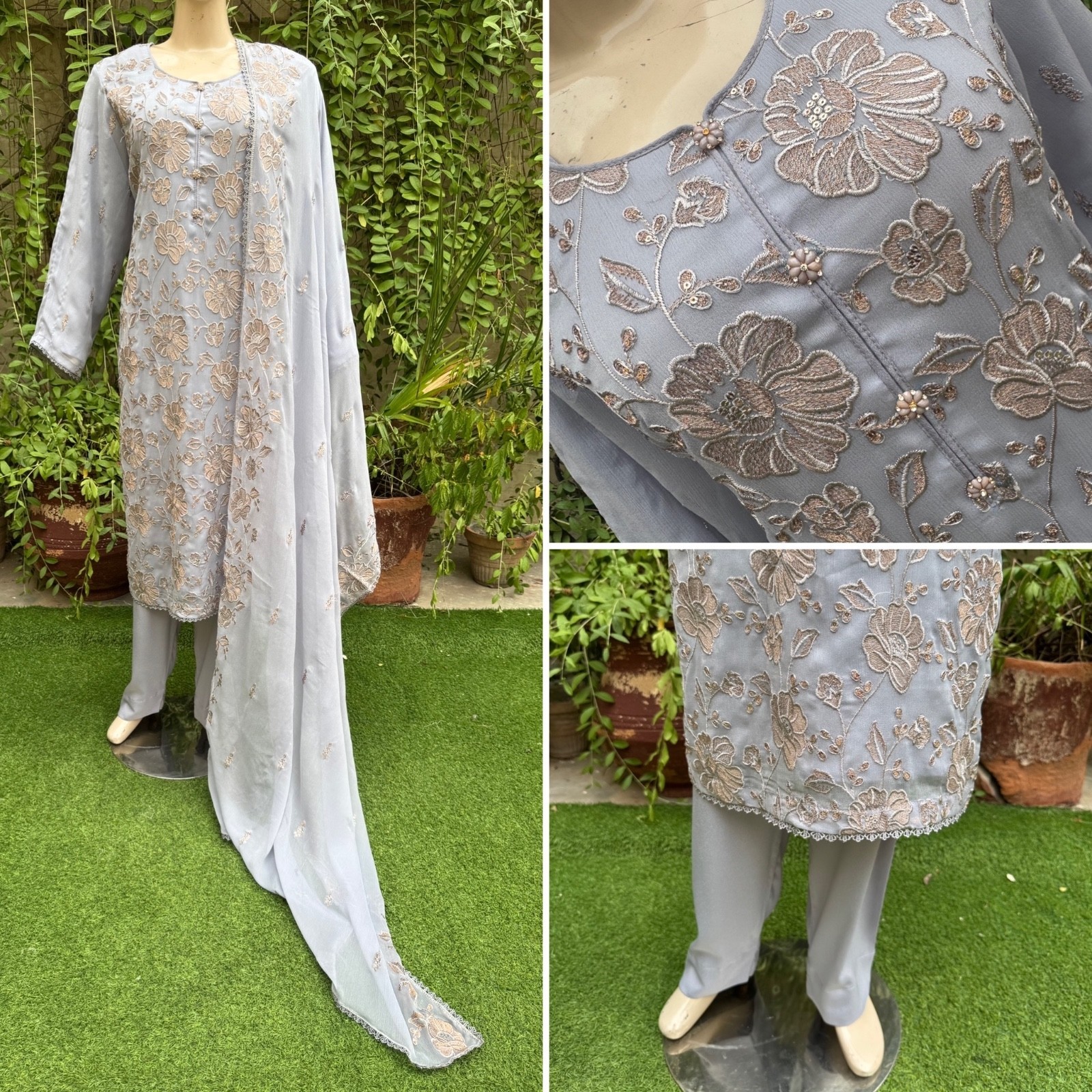 - Pakistani Light Gray 3Pcs Fancy Chiffon Dress with thread embroidery ,XL