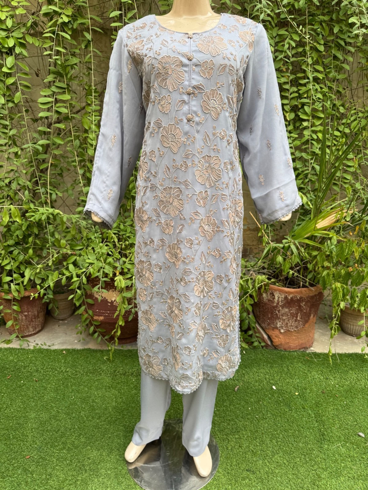 Pakistani Light Gray 3Pcs Fancy Chiffon Dress with thread embroidery ,XL