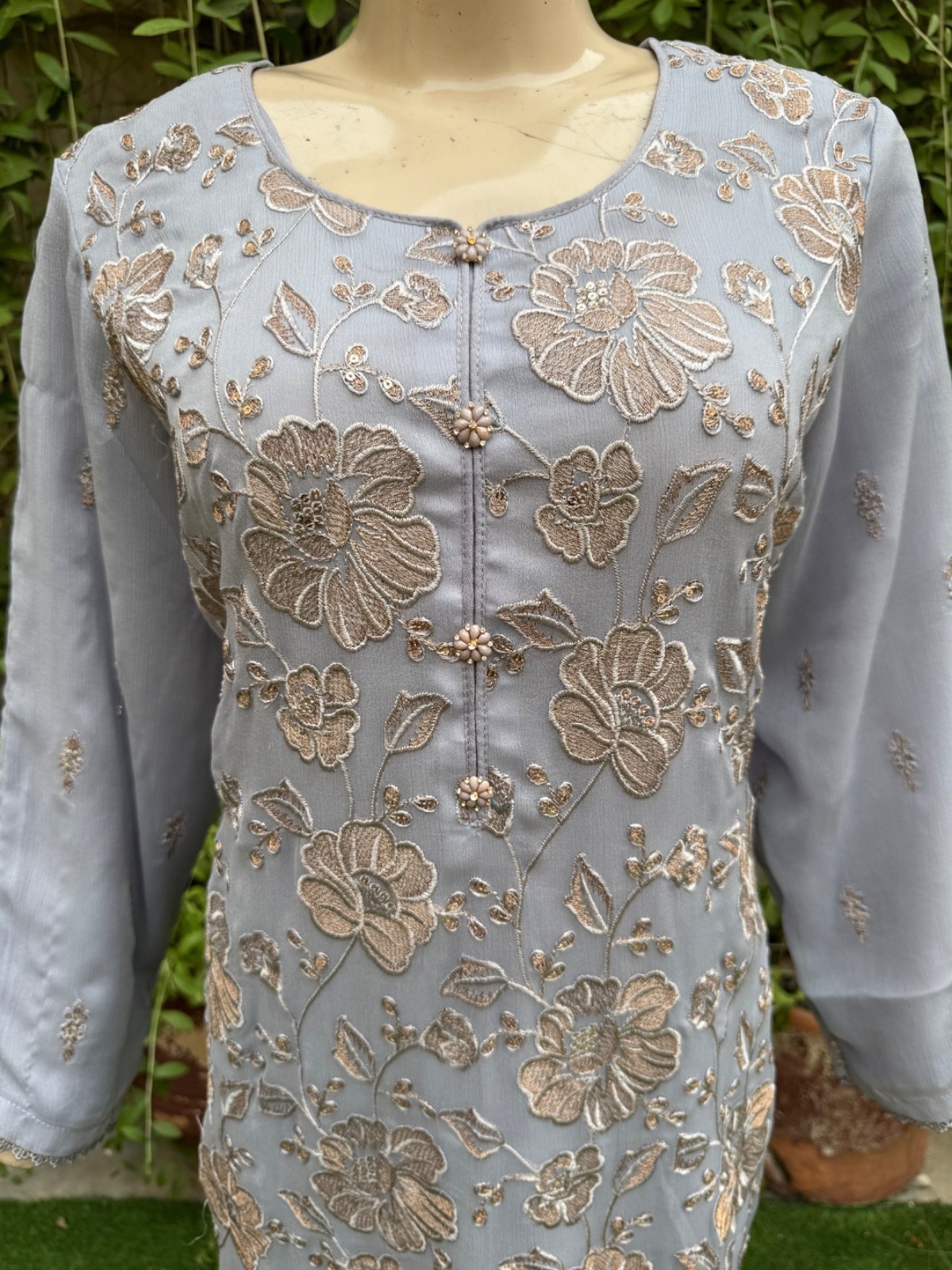 ? Light Gray chiffon straight style shirt with thread embroidery ,embroidered shirt front and back.