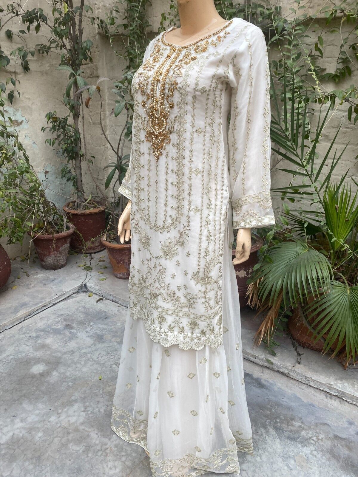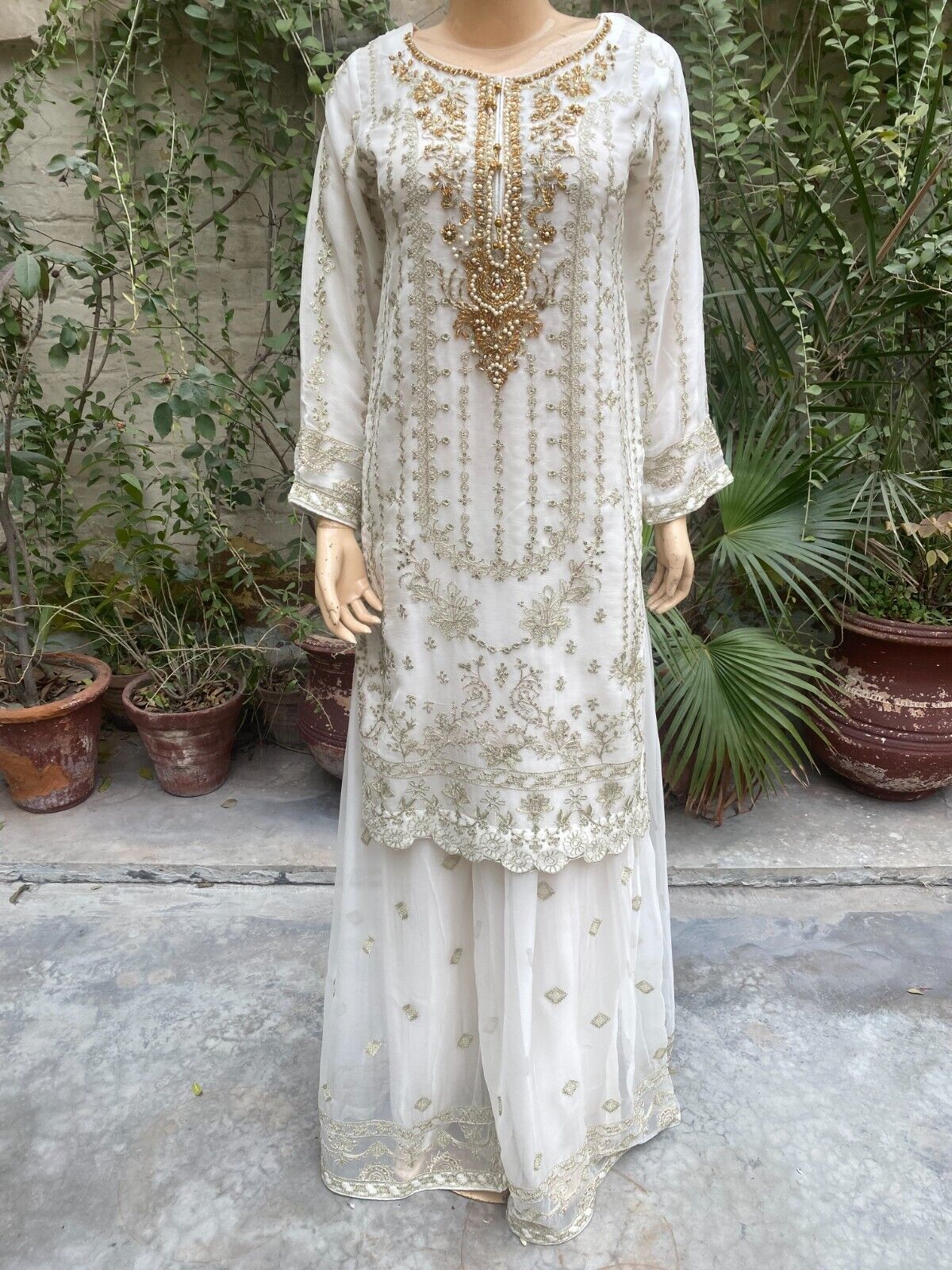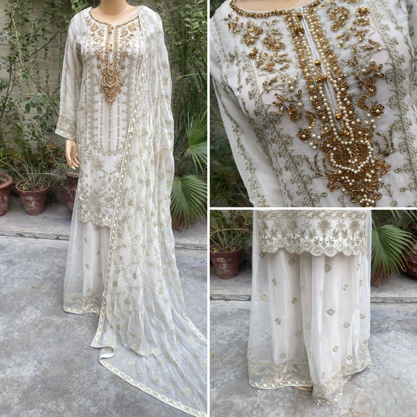 - Pakistani Off White Straight Style Embroidered Sequins Chiffon Sharara Dress,S
