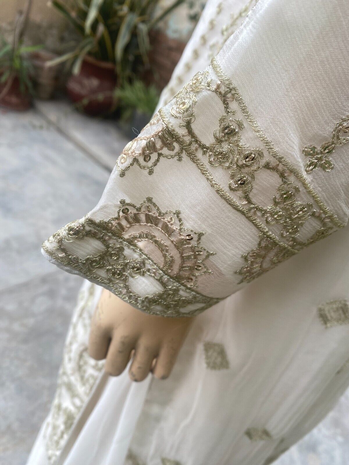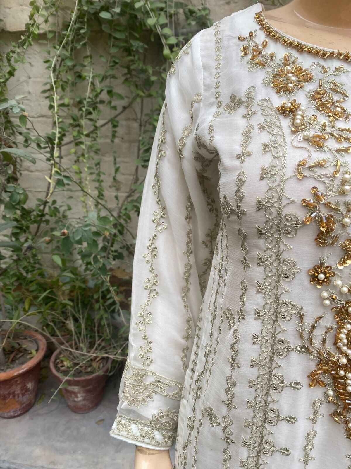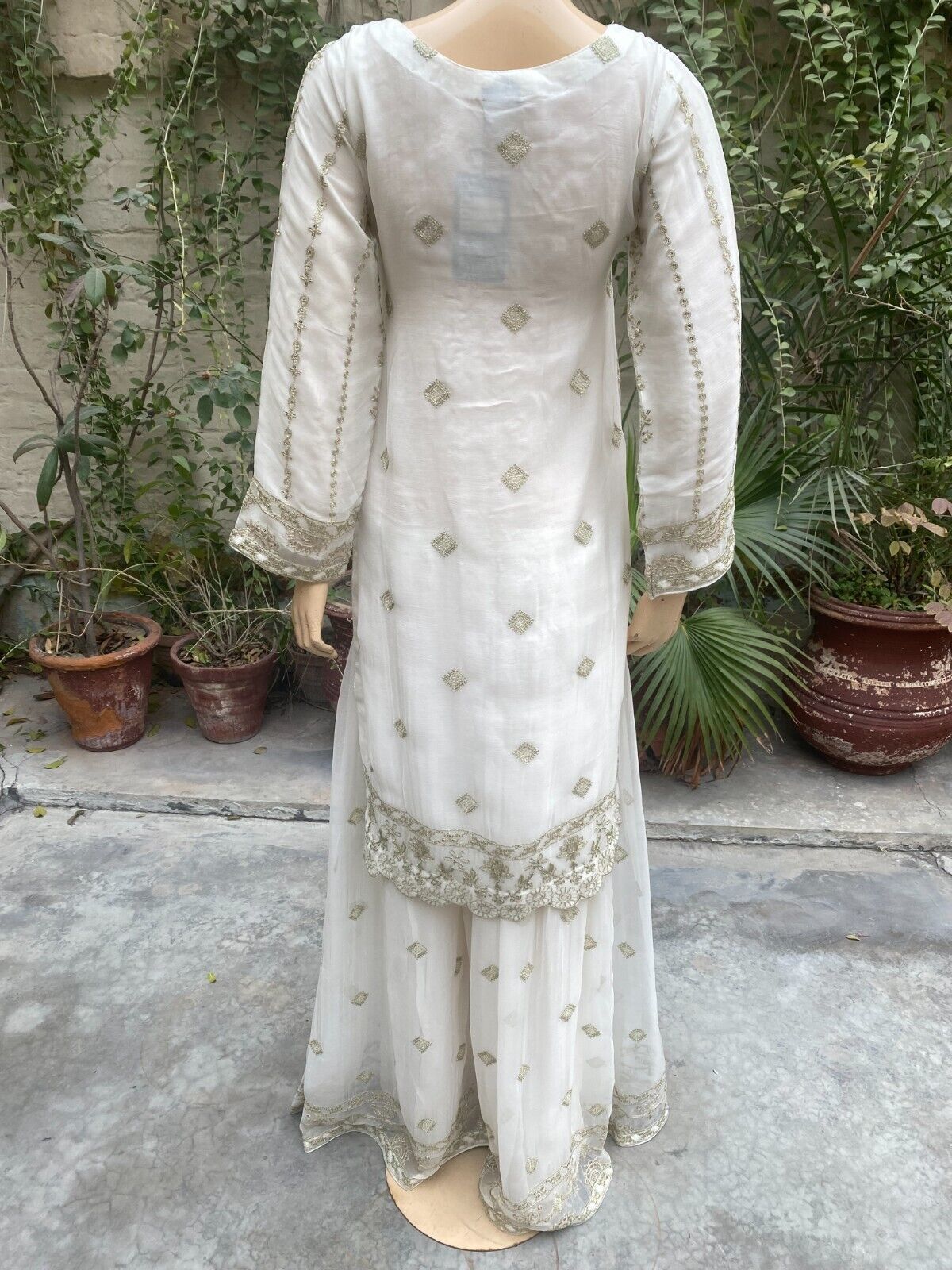 - Pakistani Off White Straight Style Embroidered Sequins Chiffon Sharara Dress,S