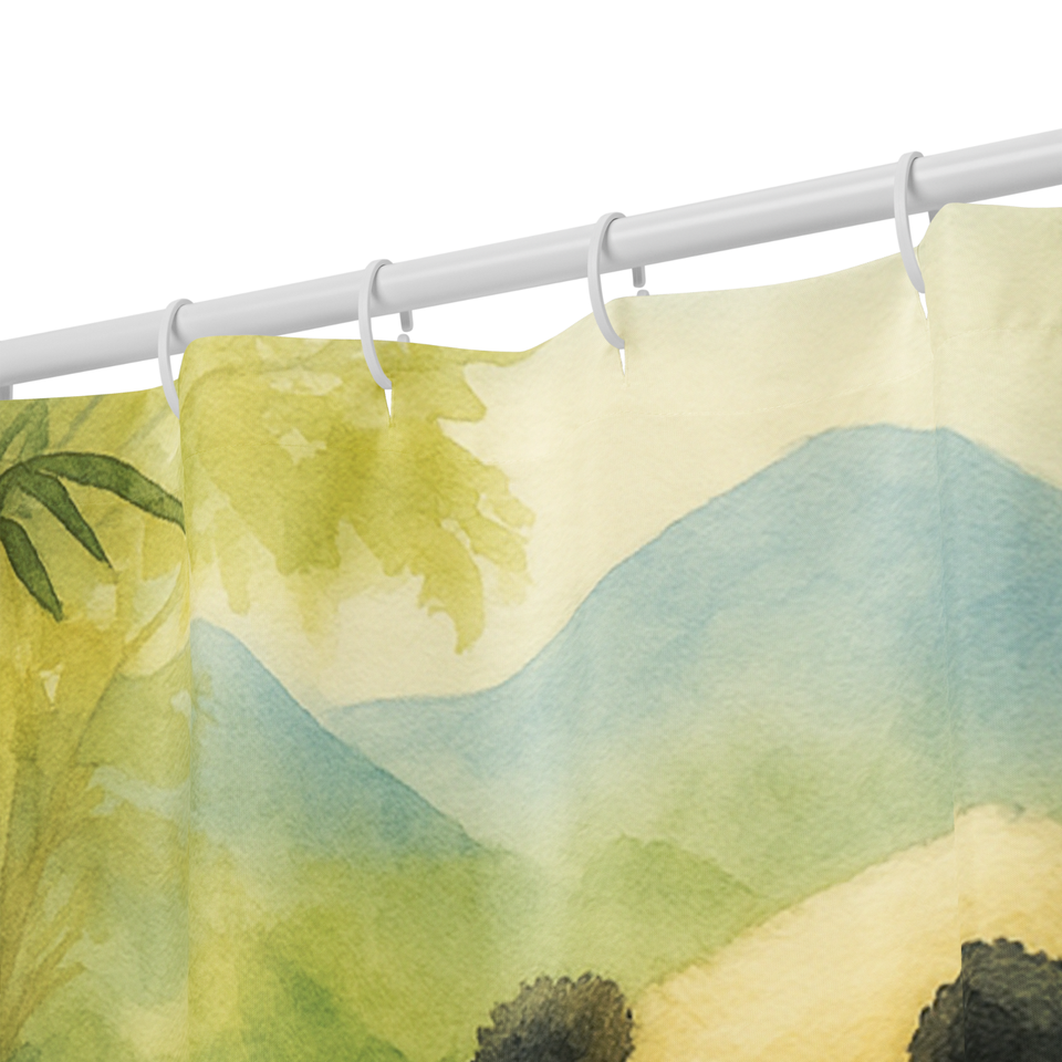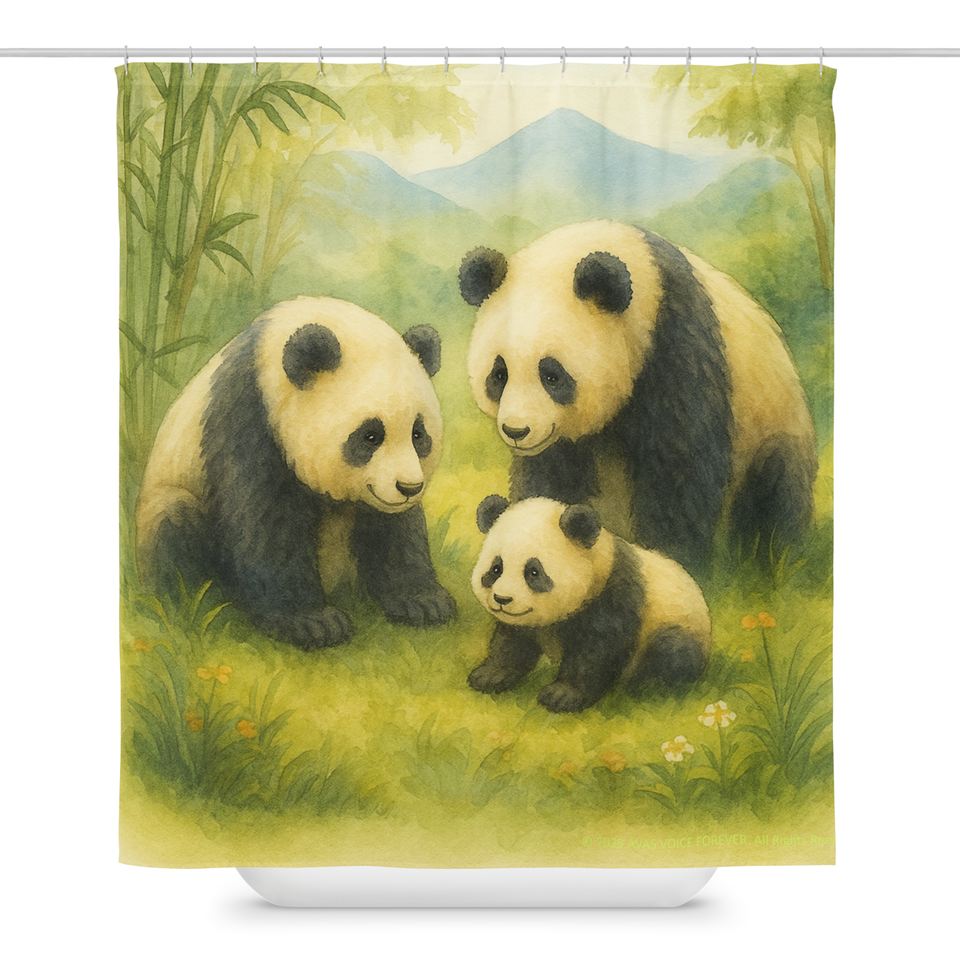 Add a touch of peaceful nature to your bathroom with this charming shower curtain featuring a watercolor-style illustration of a panda family enjoying their natural bamboo forest habitat. The gentle design captures two adult pandas lovingly watching over their playful cub, set against lush greenery and misty mountains.
