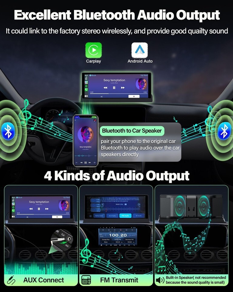 ?Dual Bluetooth, 4 Audio Outputs?Car play screen for car with improved Dual Bluetooth 5.0 for more stable transmission, you can transmit audio to your car stereo speakers for playback, realize a lossless stereo car audio experience. Wireless music volume control and hands-free calling ensure you won't be distracted on the road. The apple car play screen also supports wireless FM audio transmission and AUX audio output if your car do not have Bluetooth.