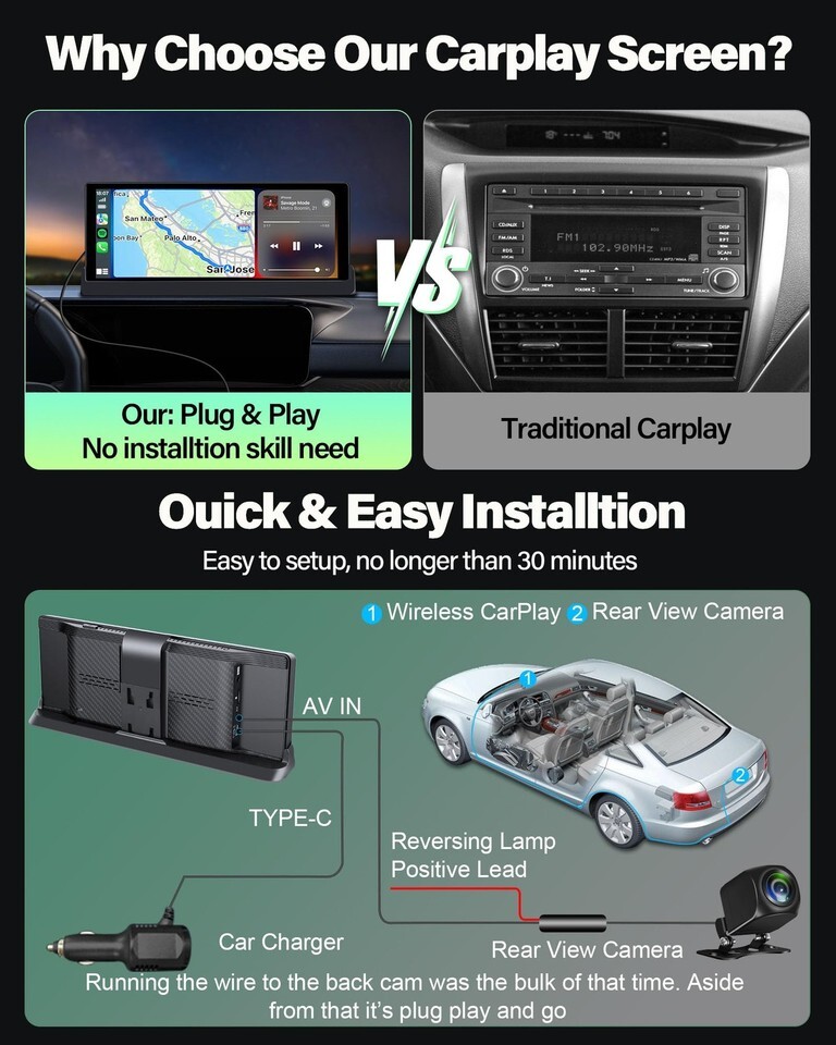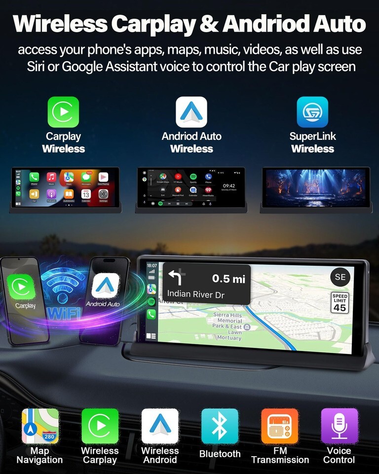 ?Wireless Apple Carplay, Android Auto?apple carplay screen for car is compatible with Apple carplay and Android Auto features. When connected to your smartphone, you can easily access Carplay/Android Auto app., maps, music and other features on the 10.26-inch touch car play screen. Portable car play screen is also compatible with wireless Airplay and Android Cast, so no matter the age or model of your car, you can enjoy a safer, smarter driving experience with this advanced technology!