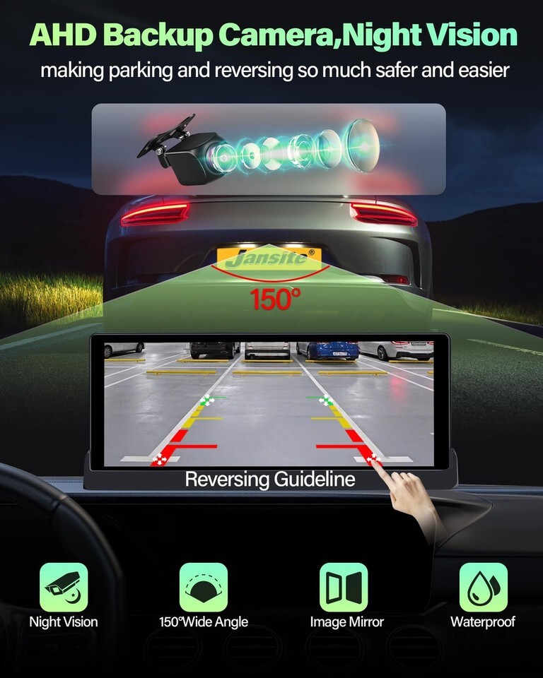 ?Wide Angle Backup Camera, DIY Reversing Line?car play screen for my car plug in with Night Vision Backup Cameras, which has improved your parking and visibility. Support night vision, automatically displays the rear view when you shift into reverse. The adjustable reverse lines and 150 ultra-wide viewing angle making parking easier.
