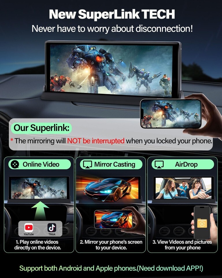 ?Latest Superlink Technology ?With the latest Mirroring technology, allowing you to control content directly from the touchscreen(For Android phone), and mirror your phone or watch online videos while keeping your phone's screen off. Sync movies, YouTube, and TikTok for a larger, clearer viewing experience. apple carplay screen for car also support Media Player, carplay has a built-in TF card slot, you can use an SD card(NOT Included) to play videos or music offline
