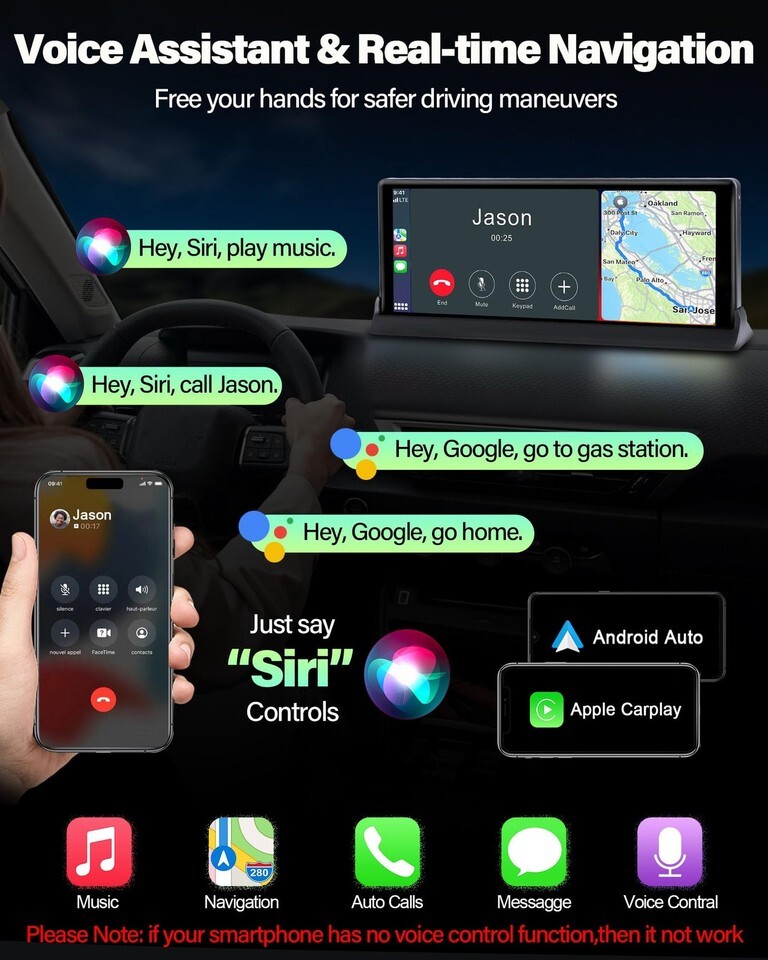 ?Real-Time Navigation, Smart Voice Control?car screen carplay supports apps like Google Maps and Waze on a widescreen display for real-time directions and optimized routes during traffic jams and lane changes, enhancing travel safety. Compatible with Siri and Google Assistant for hands-free control of navigation, calls, messaging, and music, ensuring you stay focused on the road.
