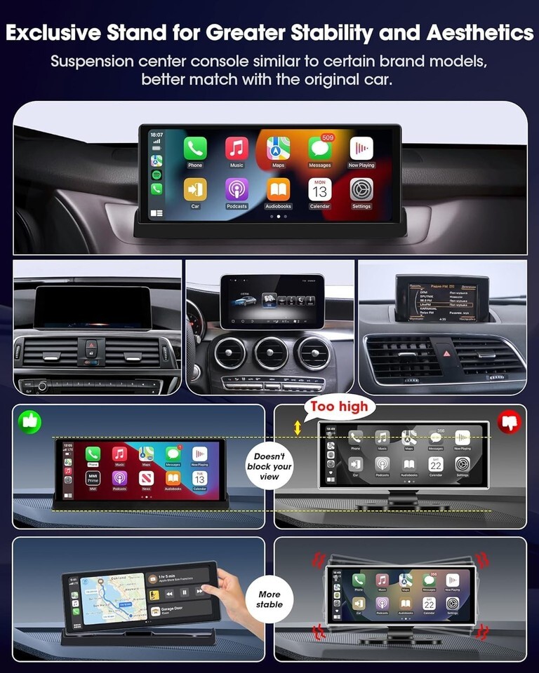 ?Unique Bracket, No Blocking View and Shaking??No Blocking View: customized bracket fits better with carplay screen, never block drivers' view. ?No Shaking: Carplay Bracket with bigger contact with dash board, more stable,solving the problem of old adhesive/ suction bracket which is easy to peel off and fall off, never shaking and tipping when driving.?Be one with your car:carplay bracket makes the carplay screen looks like the original car screen, more comfortable and beautiful!