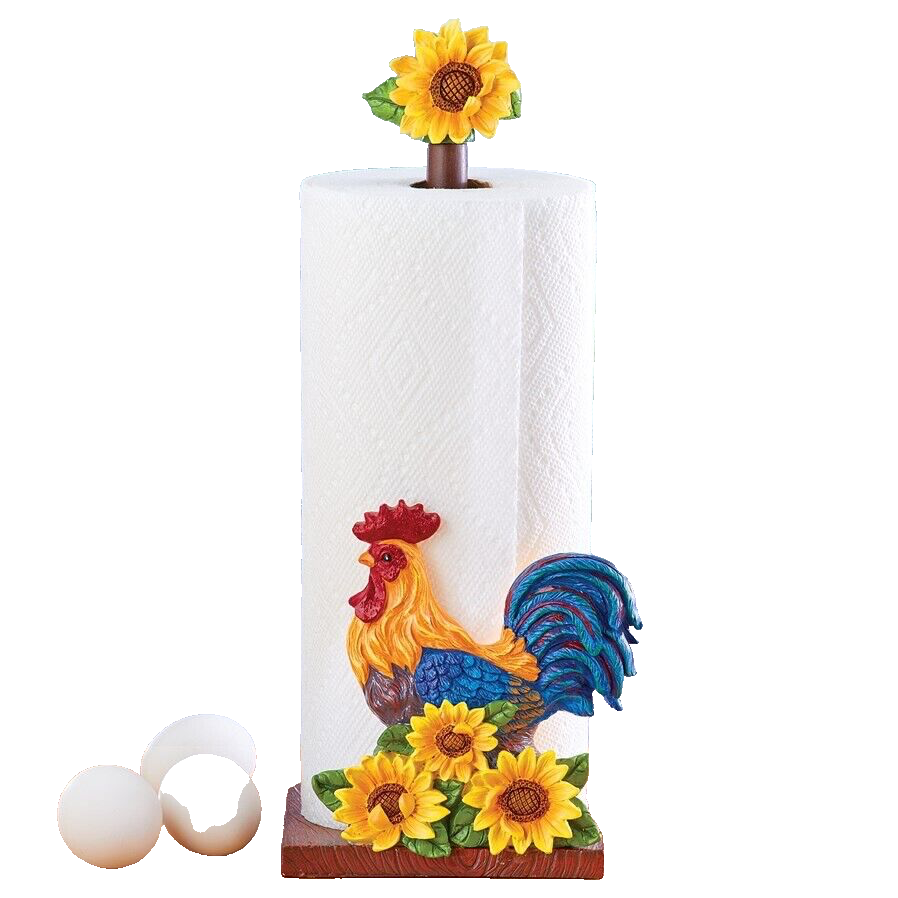 This colorful paper towel holder features a beautifully detailed rooster nestled among bright sunflowers and holds one standard paper towel roll (not included).