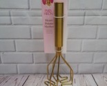 This is a Paris Hilton heart-shaped potato masher made of stainless steel. The masher is gold in color and dishwasher safe. It features a handle also made of stainless steel. The set includes one masher and is new. The design follows a Paris Hilton theme, making it a stylish addition to any kitchen.