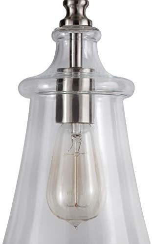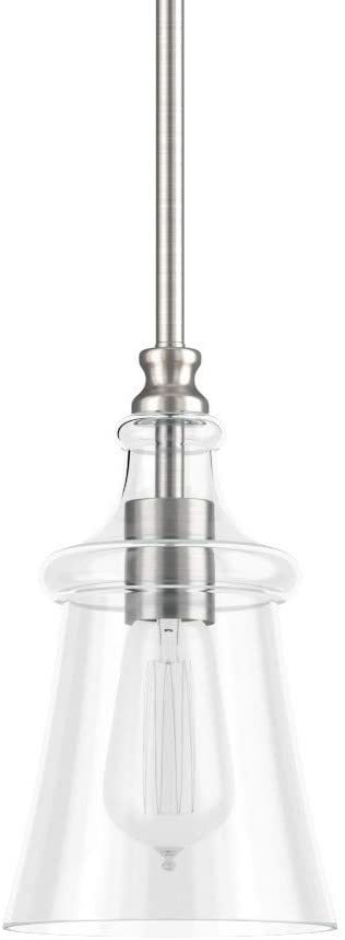 Item Notes:Model # PHPL5481BN 9.5H x 5.75W Canopy contains built in swivel allowing fixture to be mounted on sloped ceiling at up to a 90 degree angle. Ceiling Plate / Canopy: 5W x 1.25D Includes 42 of downrods (3 x 12 and 1 x 6), 180 of wire. Maximum Haning Height is 54.5. No special tools needed for assembly. Requires(1) 100W Bulb with E26 Bulb Base (not included). Total Wattage: 100W Hand-blown clear glass shade, brushed nickel finish, no bulbs included.