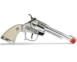 Solid die-cast metal repeater cap pistol with plastic grip and silver finish. Fires classic roll action caps.