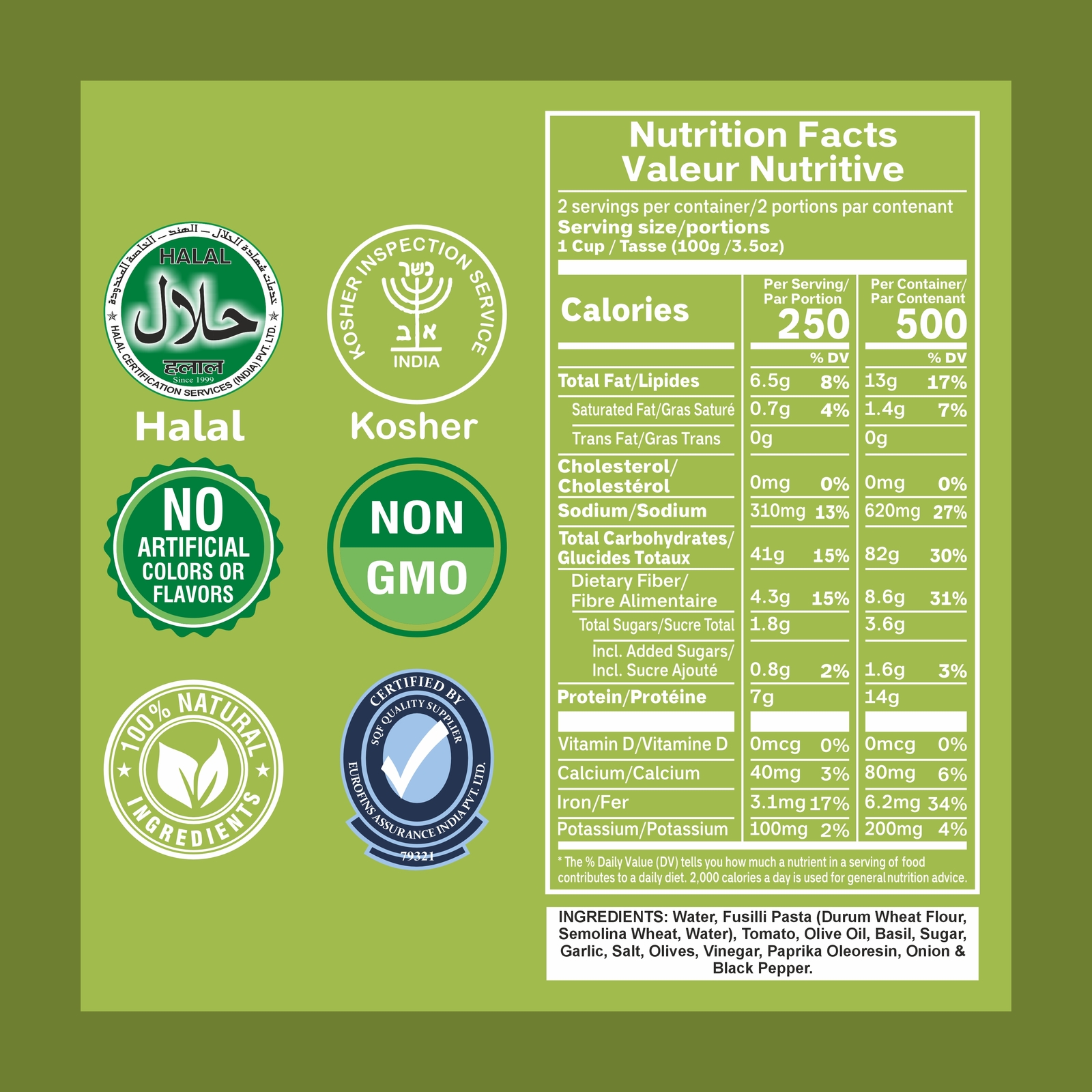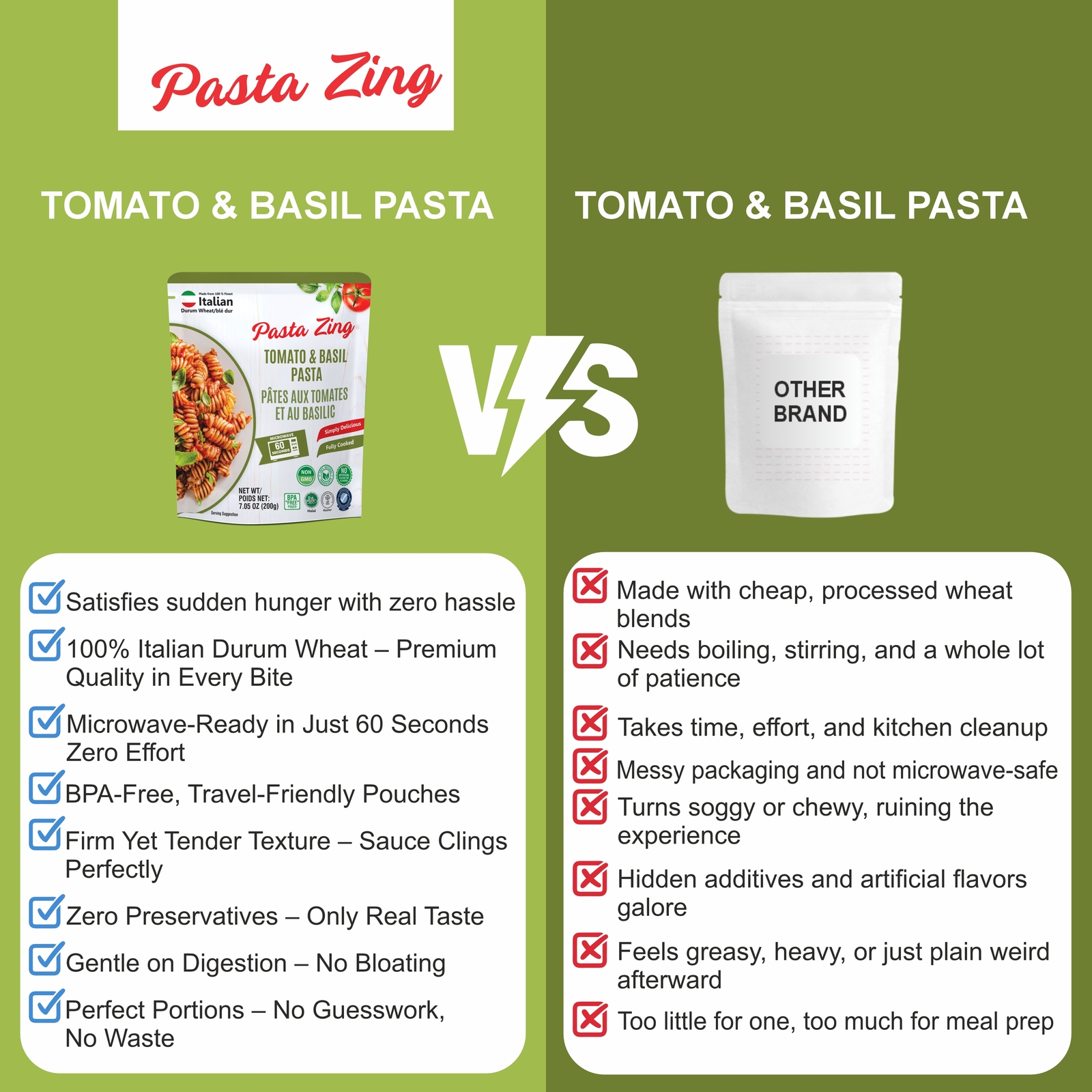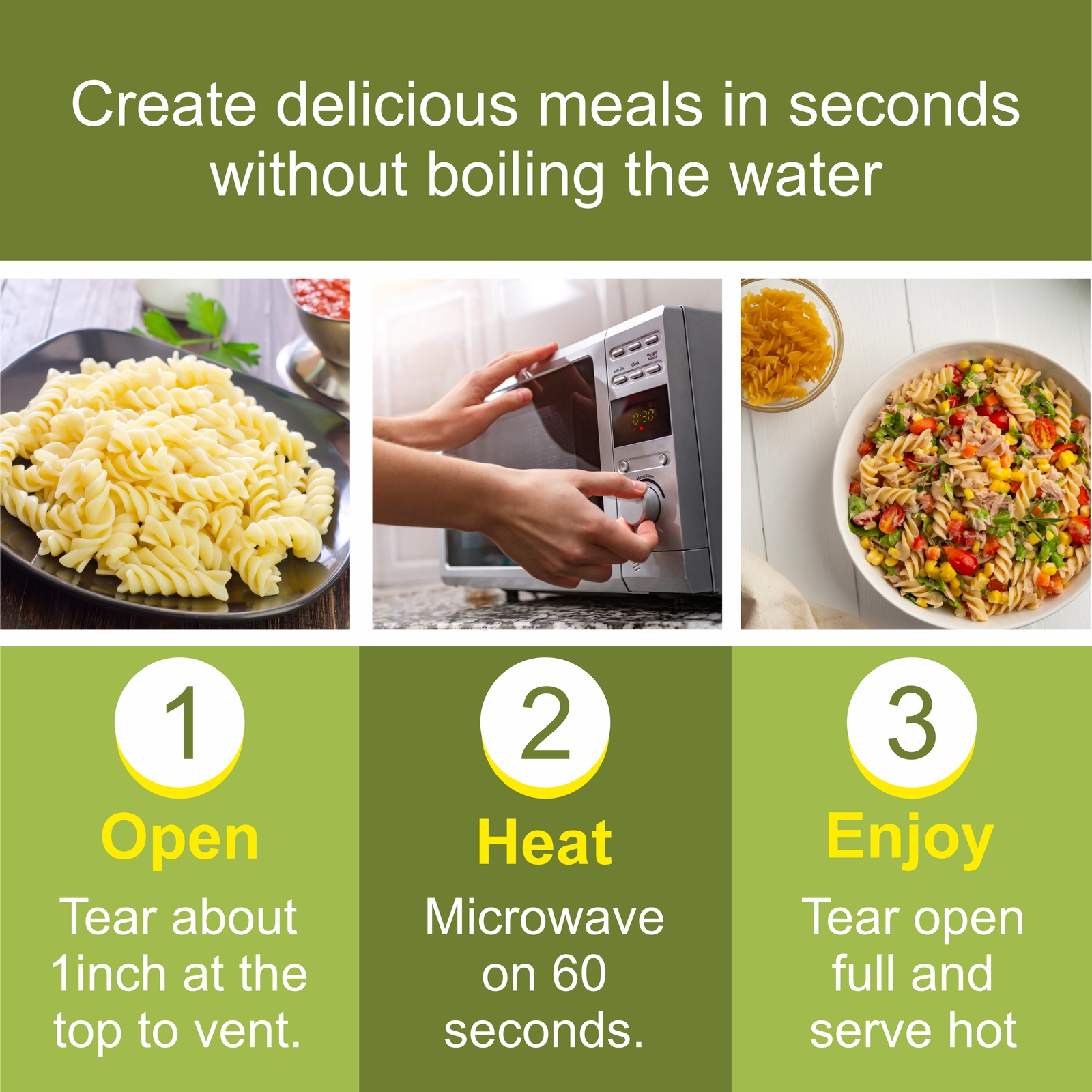Pasta Zing Tomato Basil Pasta is the perfect solution for a quick and delicious meal. Made with 100% Italian durum wheat, this microwavable pasta is ready to eat in just 60 Seconds—no prep or cooking required. The authentic Italian flavor of tomato and basil is combined with natural ingredients, offering a healthy, low-fat option that’s free from artificial colors, flavors, and preservatives. Non-GMO, halal, and kosher certified, it meets a variety of dietary needs. The ready-to-heat pouch ensures consistent quality and flavor every time. With a long shelf life, this cost-effective, easy meal helps reduce food waste and is ideal for busy weeknights, meal prep, or emergency food storage.