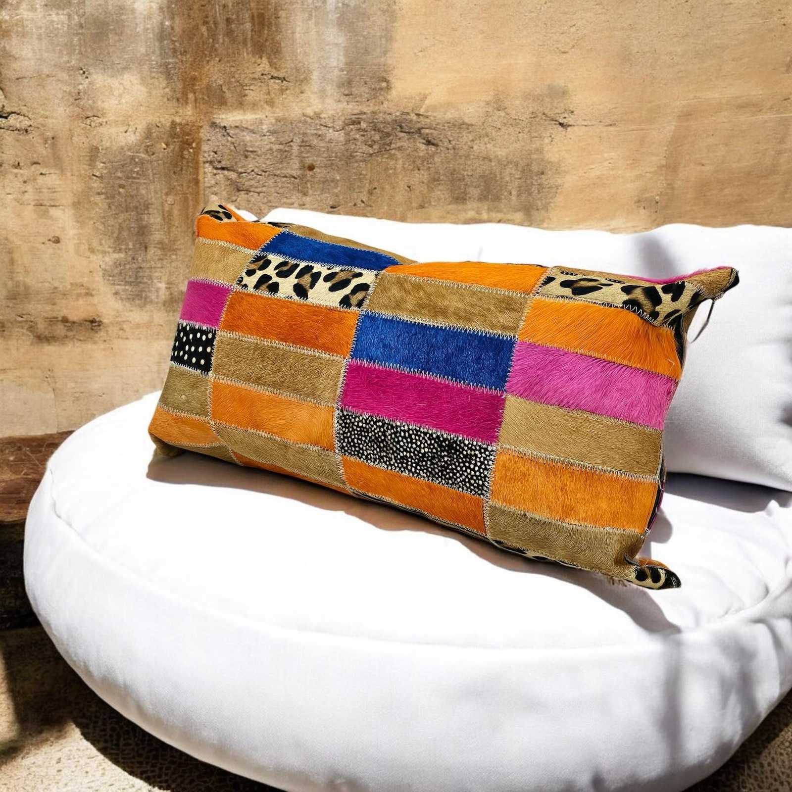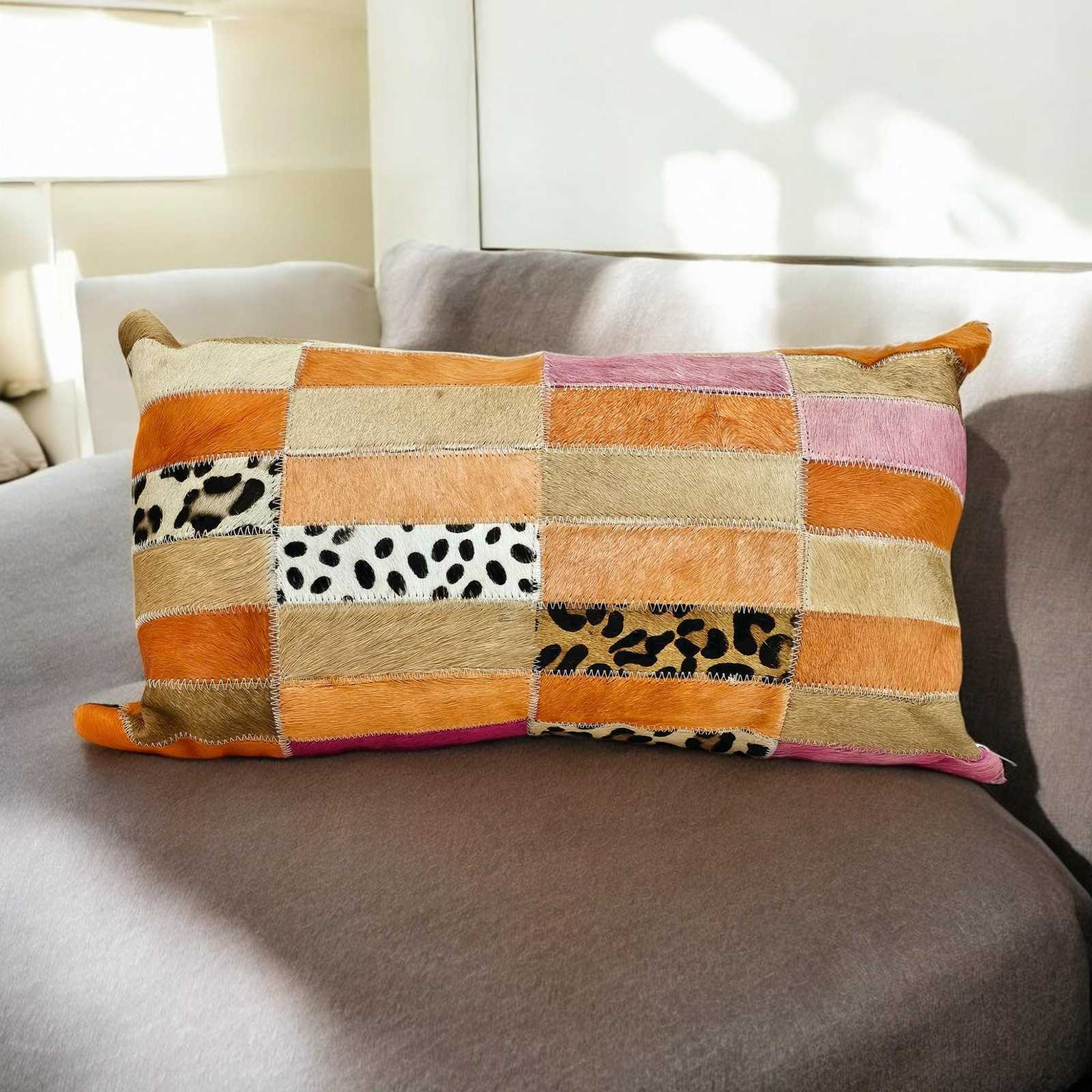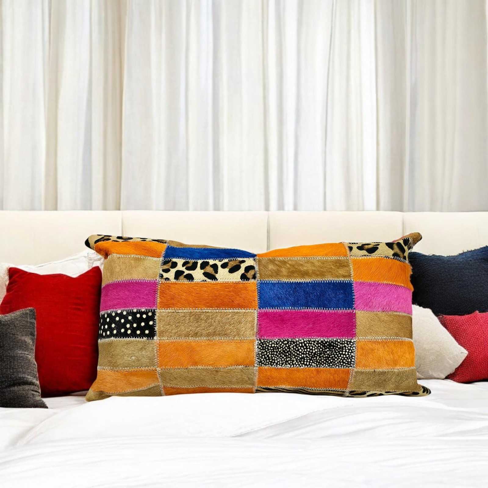 - Patchwork Goat Leather Pillow Cover: Boho Western Animal Print Cushion 20"x11"