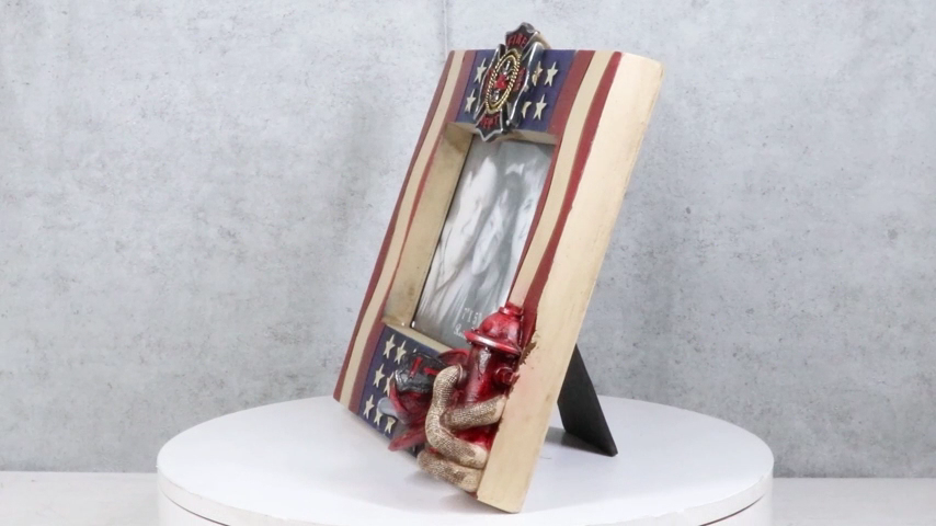 ? This Fire Department With Patriotic US Flag Picture Frame is made of polyresin, hand painted and polished individually. It is equipped with easel back for table top or shelf display. You can also hang this picture frame on your walls.