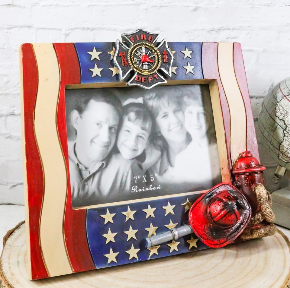 - Patriotic Maltese Cross Fireman Helmet Hose Fire Hydrant USA Flag Picture Frame