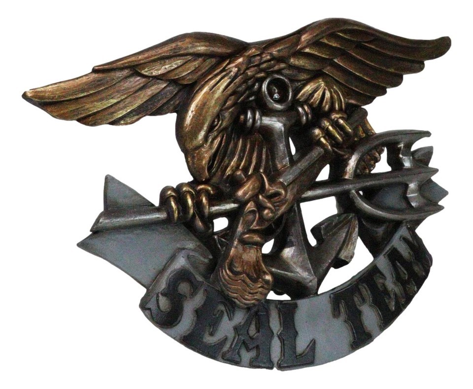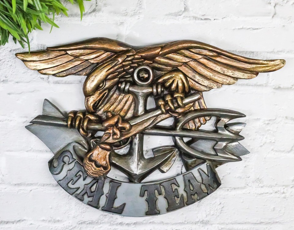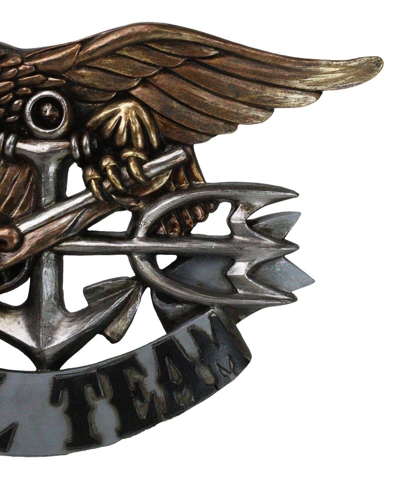 ? Honor your patriotism and military pride with our US Navy SEAL Team Emblem Decor Plaque. This striking piece features the iconic Navy SEAL emblem, complete with a powerful eagle, a formidable anchor, a trident, and a historic flintlock pistol. Crafted with meticulous attention to detail, this plaque celebrates the bravery and dedication of the SEALs while adding a distinguished touch to your decor.