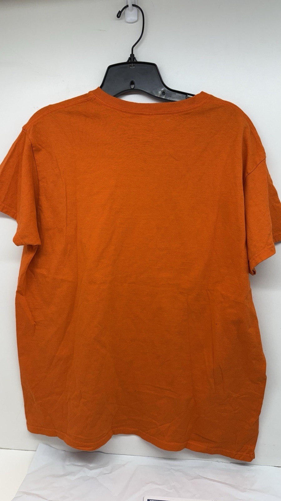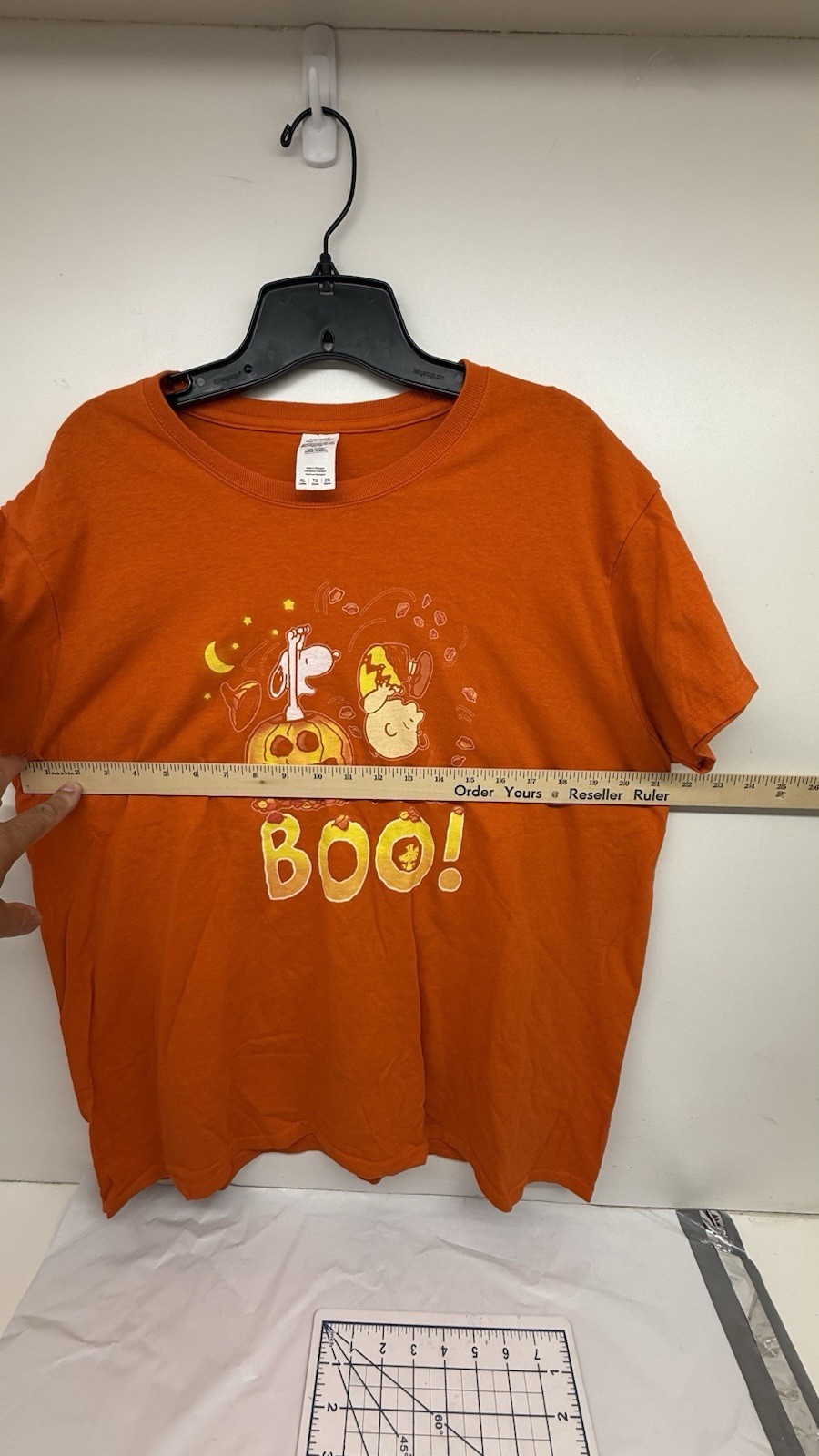 The product is a men's XL T-shirt featuring a Halloween theme with characters from the Peanuts brand, specifically Snoopy and Charlie Brown. The shirt is orange in color, made of 50% cotton and 50% polyester, and has a crew neck and short sleeves. Perfect for those who enjoy a fun and festive Halloween look with a touch of nostalgia from beloved Peanuts characters.