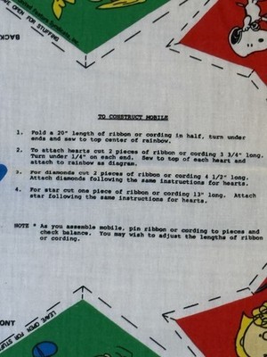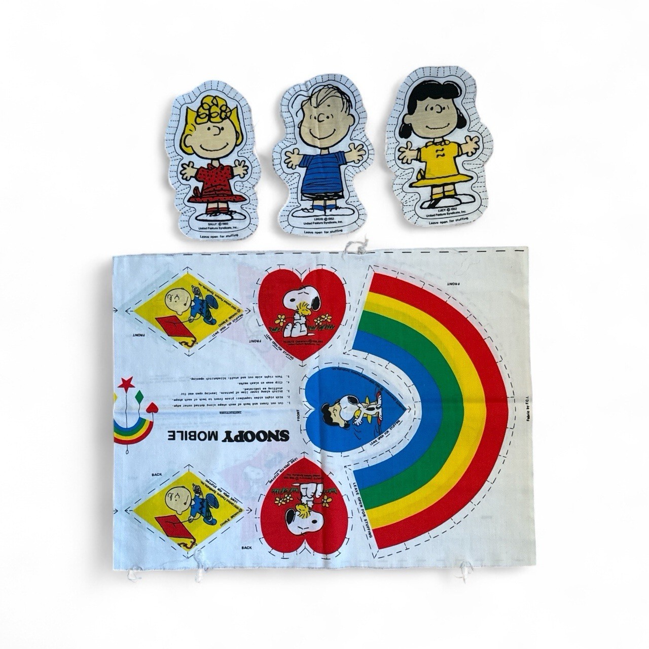 Vintage snoopy mobile cut and sew. Everything in the pictures are included. All pieces have the front and back side. The cutouts are marked with dates between 1952 to 1963. I was going to make a blanket out of these pieces and never got around to making it. These would be really cute made into a blanket or little dolls for play. Mini pillows would be cute too!