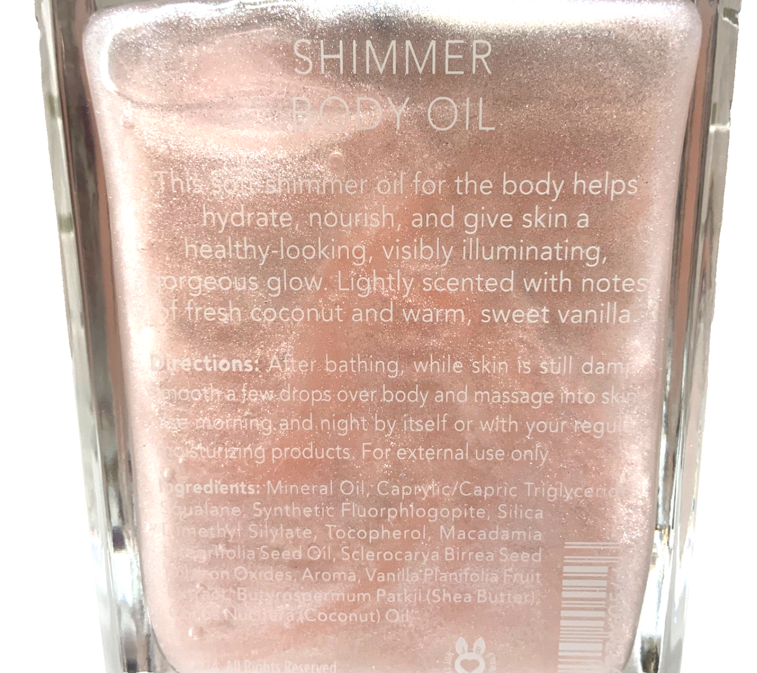 This soft shimmer oil helps hydrate, nourish and give skin a healthy-looking, visibly illuminating, gorgeous glow. Lightly scented with notes of fresh coconut and warm, sweet vanilla.