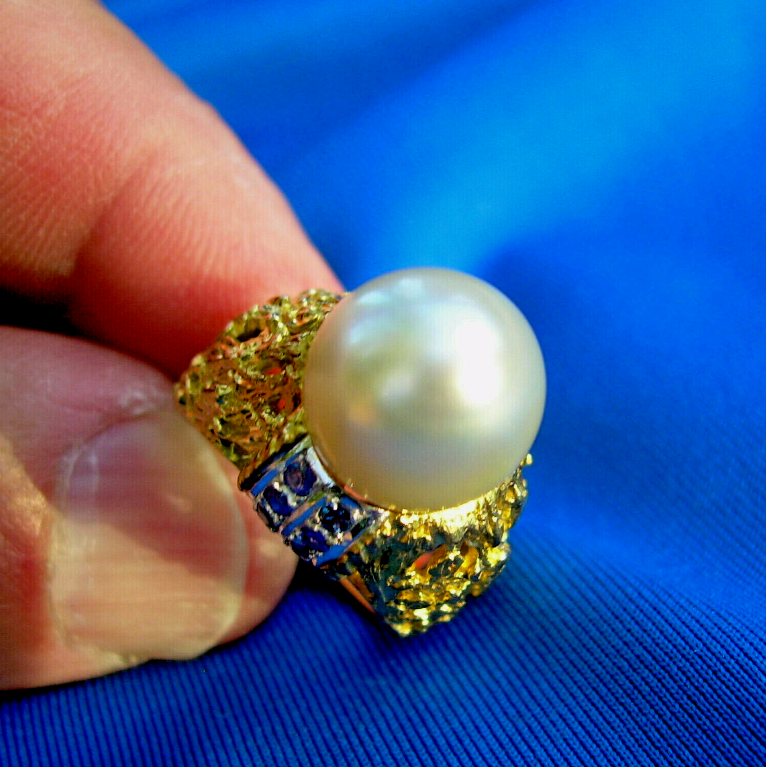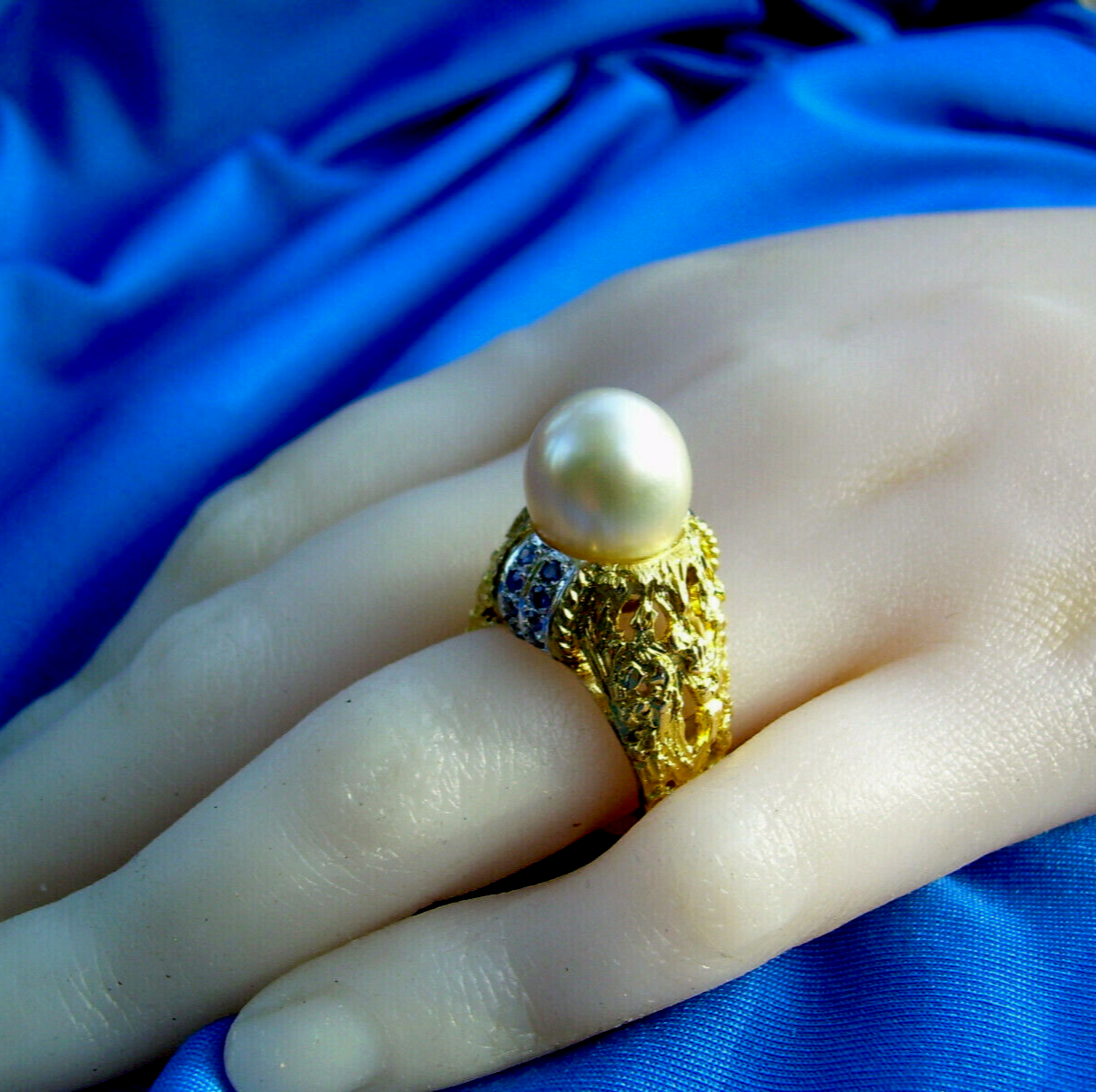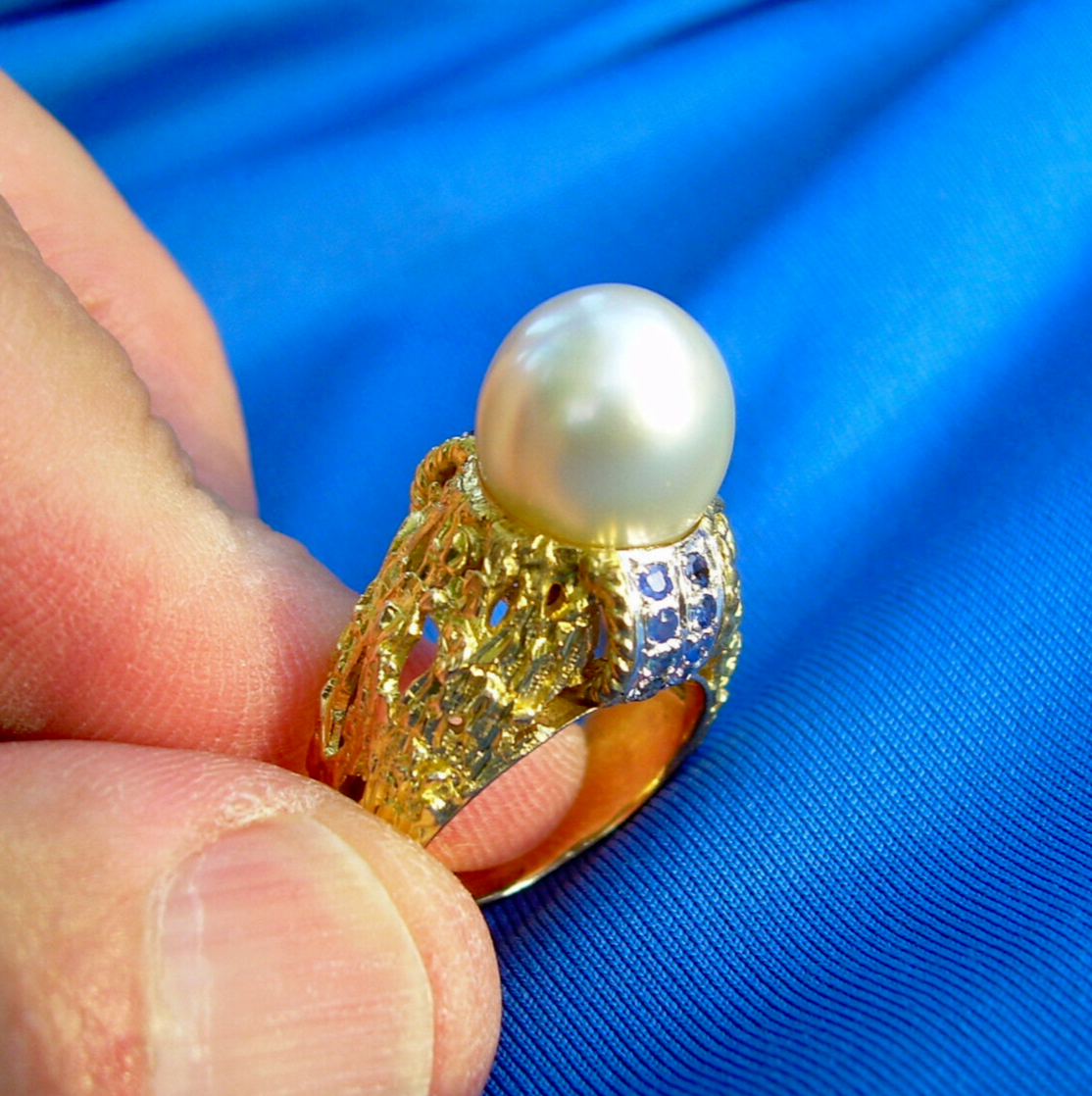 - Pearl Sapphire Engagement Statement Ring Deco Cocktail Dinner Style 14k Gold