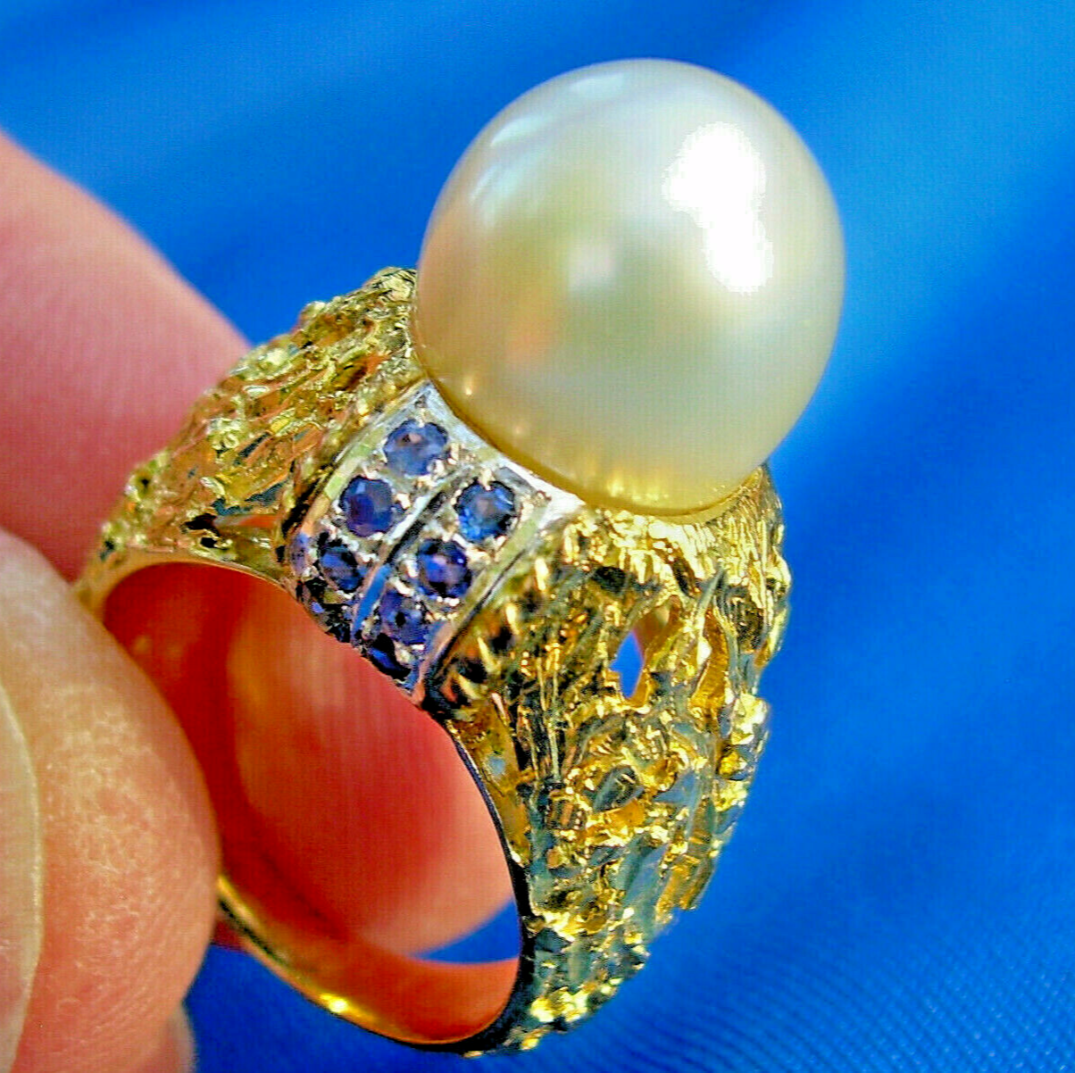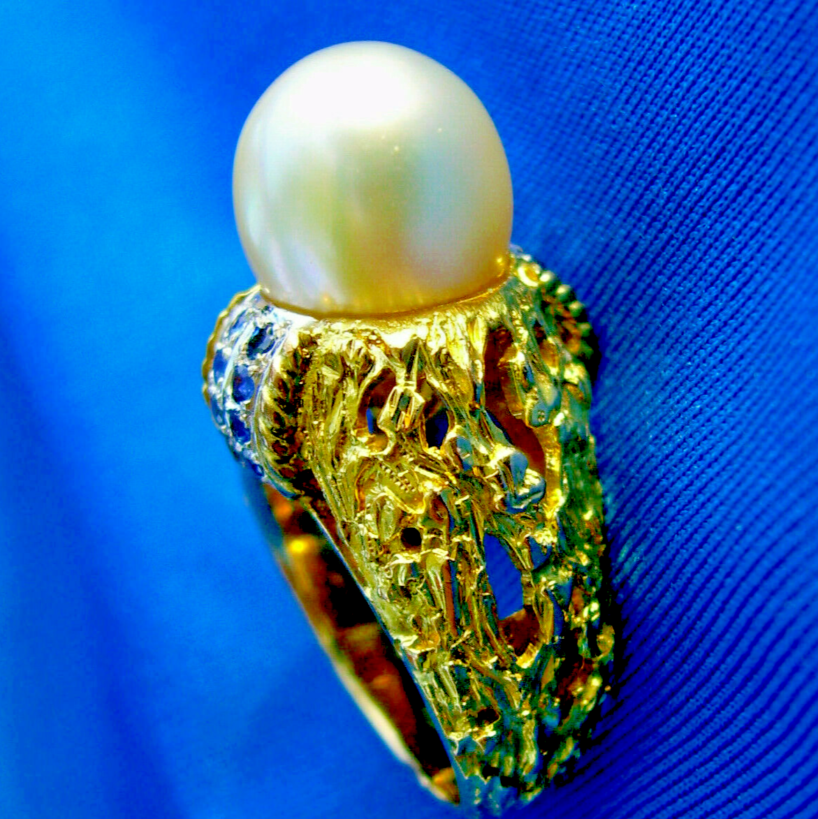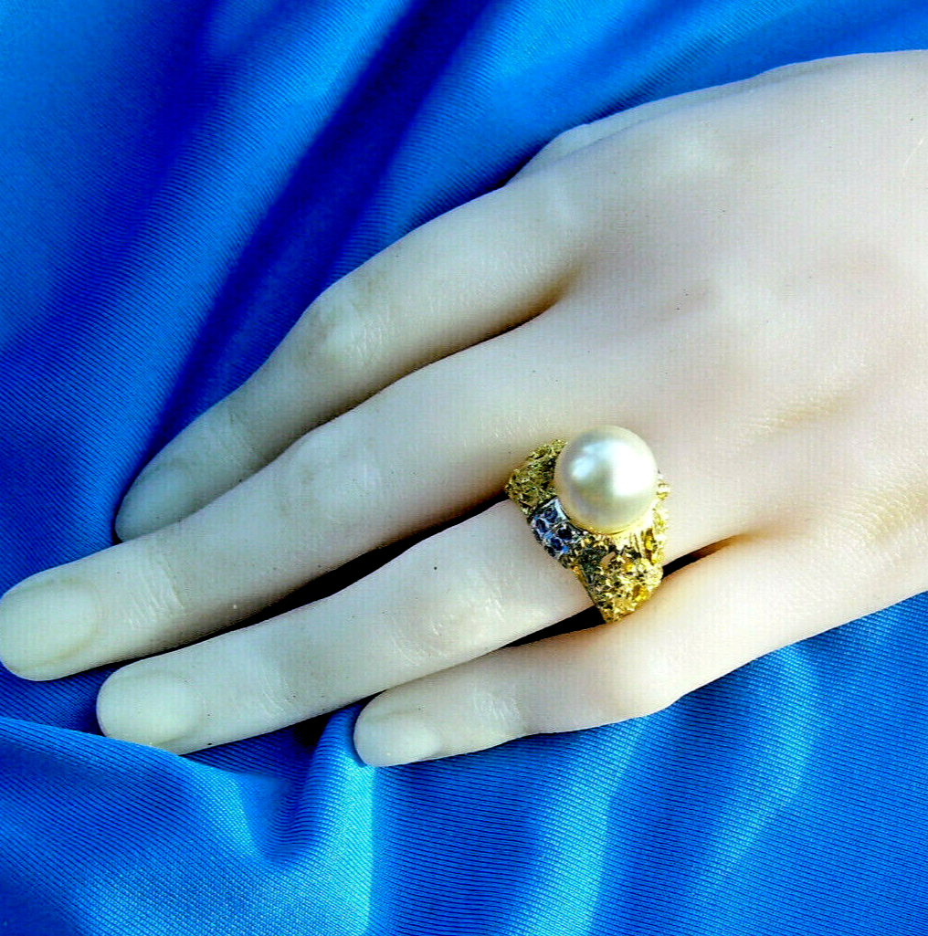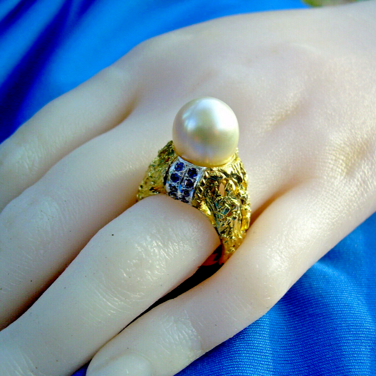 - Pearl Sapphire Engagement Statement Ring Deco Cocktail Dinner Style 14k Gold