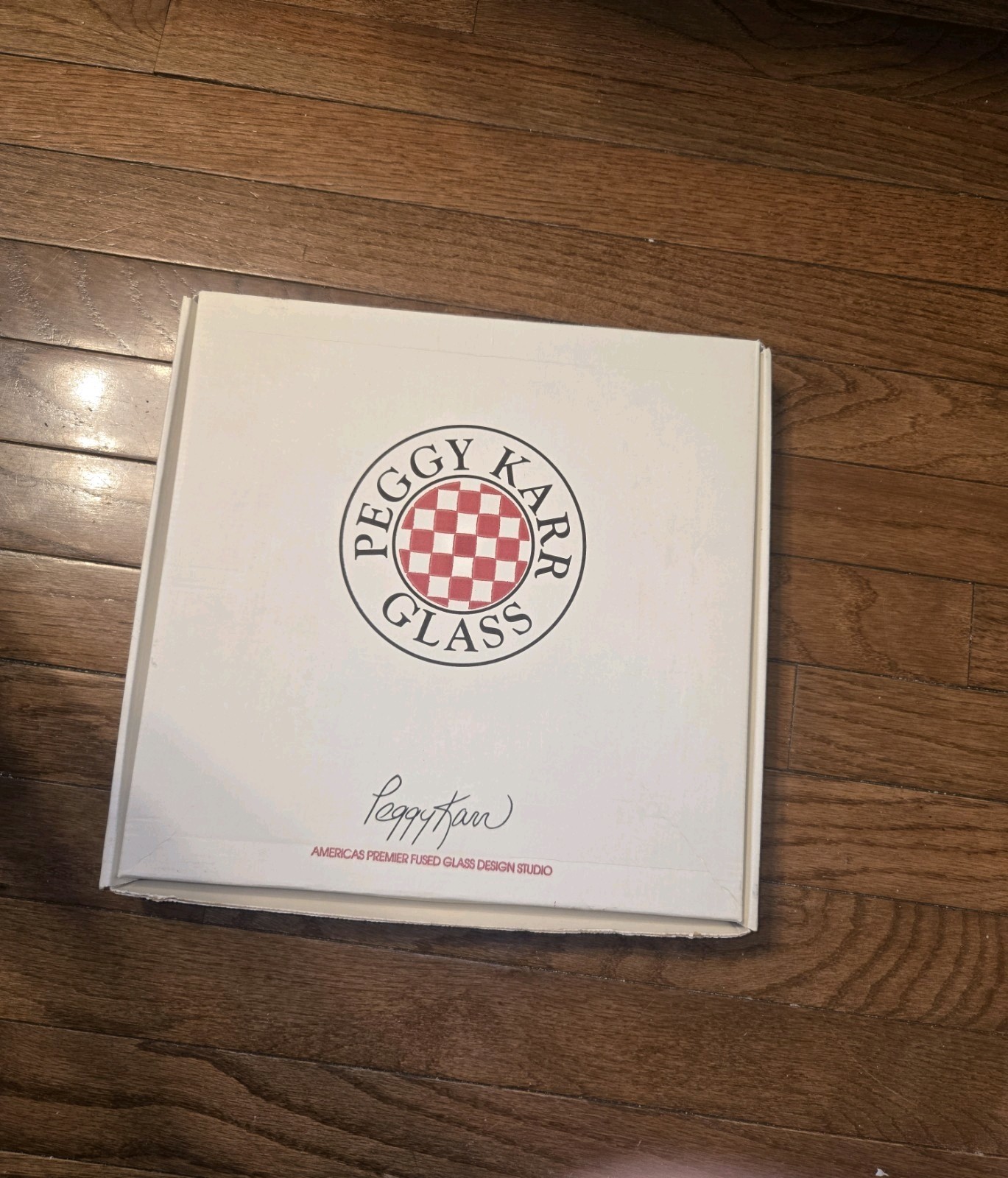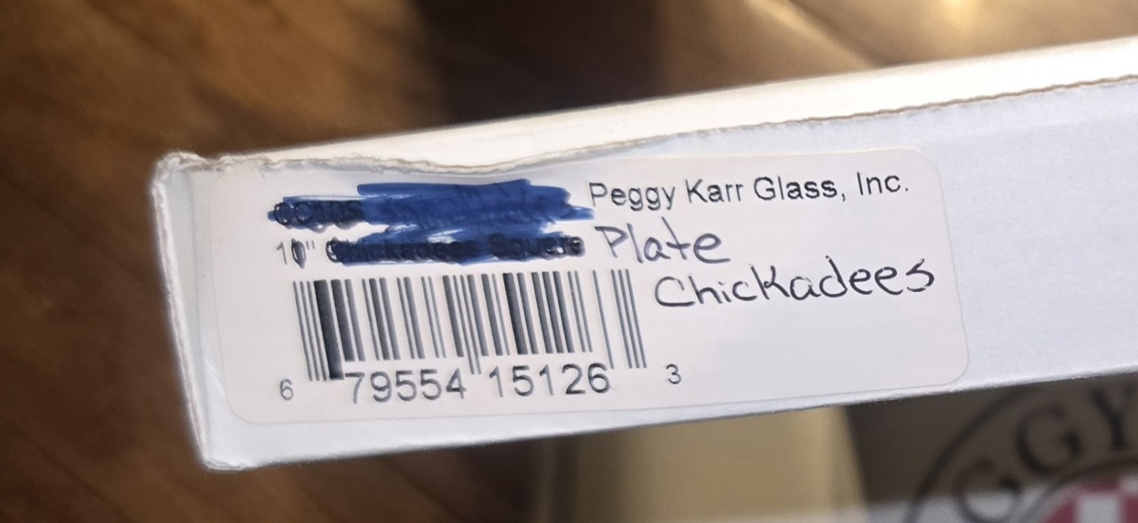 The Peggy Karr fused glass dish with chickadees is an 11-inch round plate made of multicolor glass. Few light scratches check pics