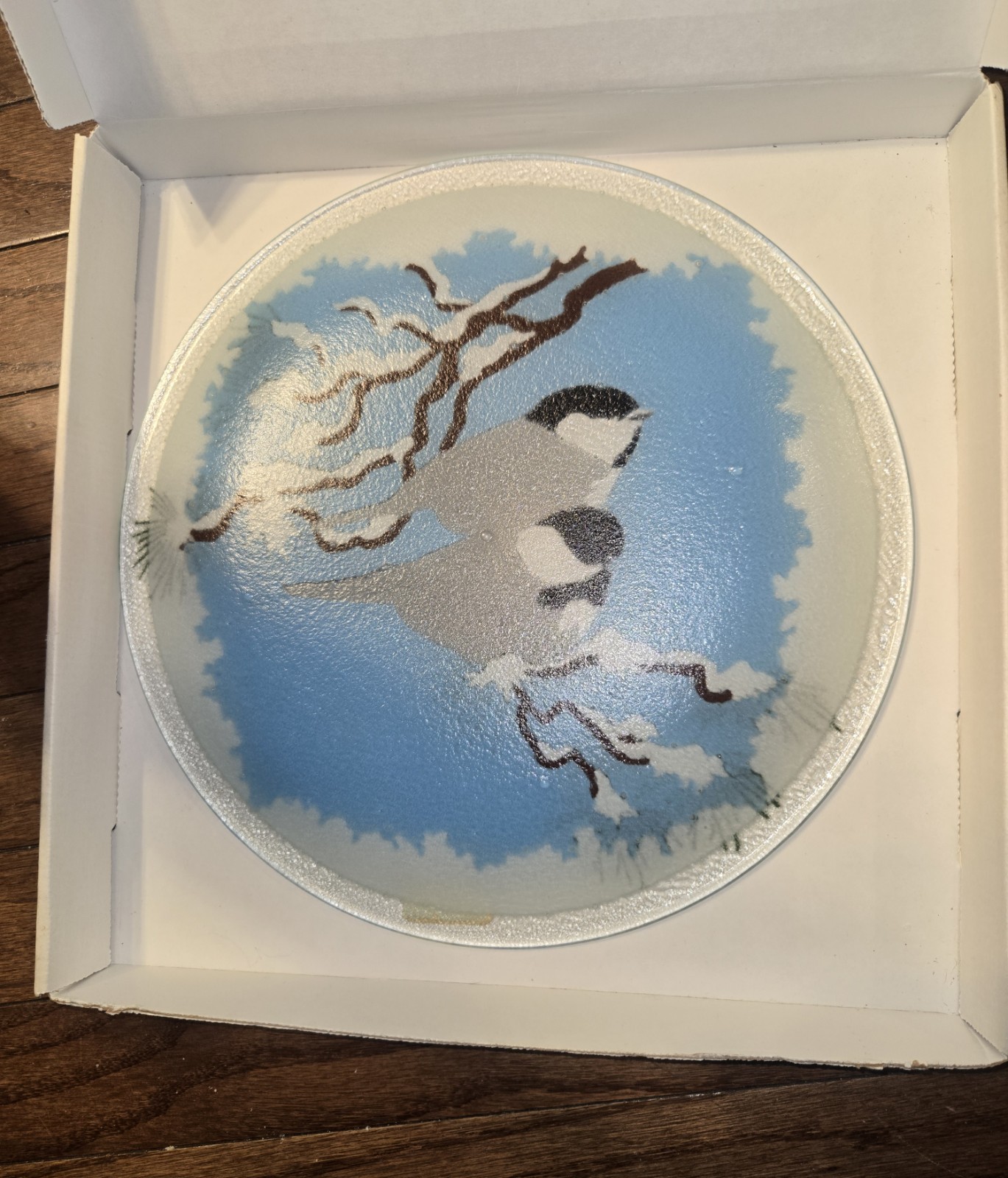 - Peggy Karr fused glass dish with chickadees 11 In.