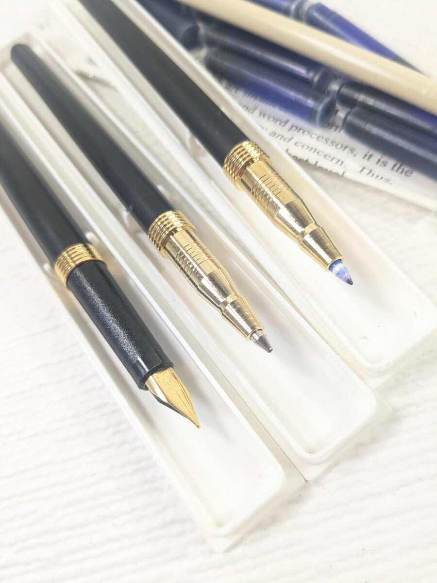 Not sure if these were ever used. Includes fountain pen, ball point pen, and roller point pen. Includes blue ink refills and cases for pens. See pics.