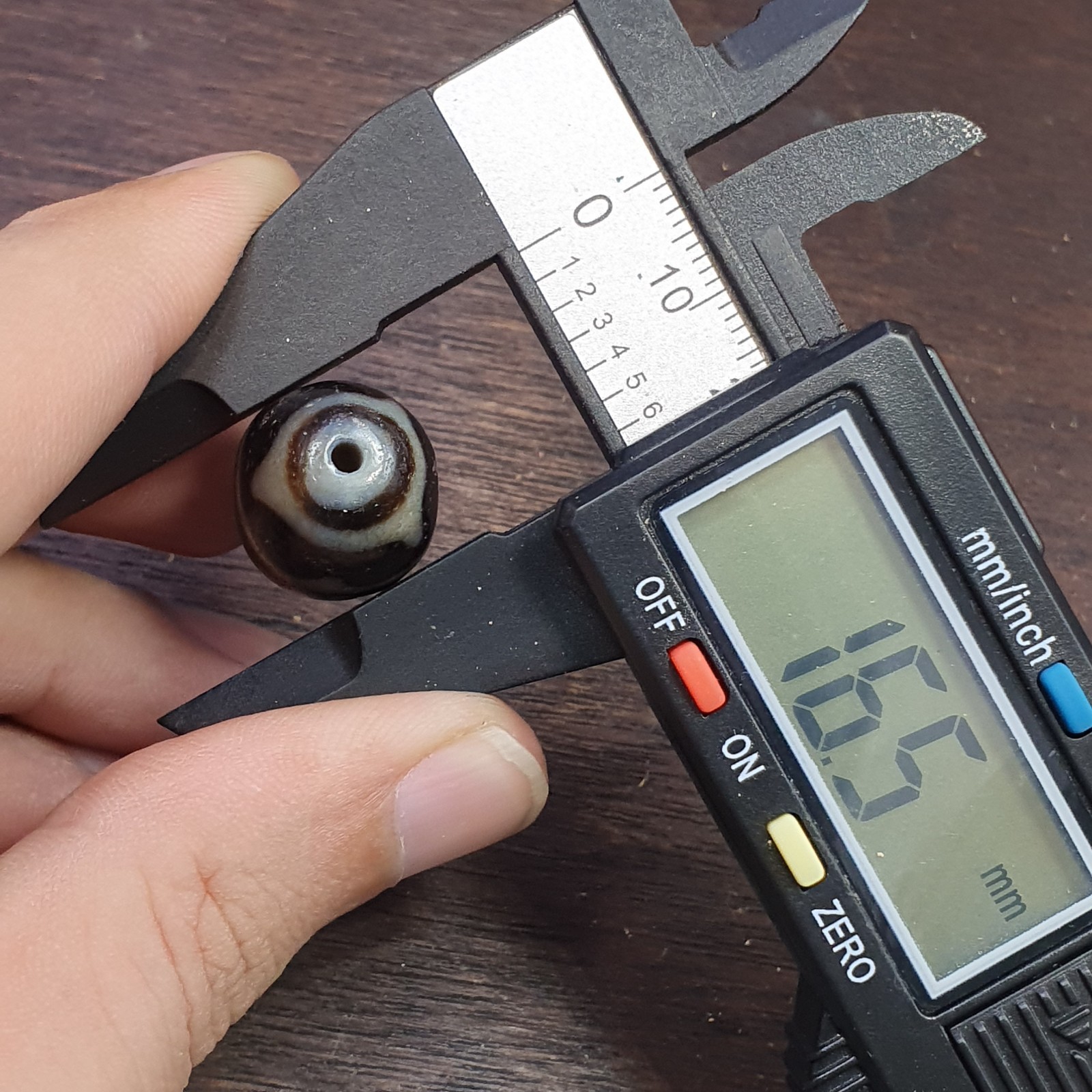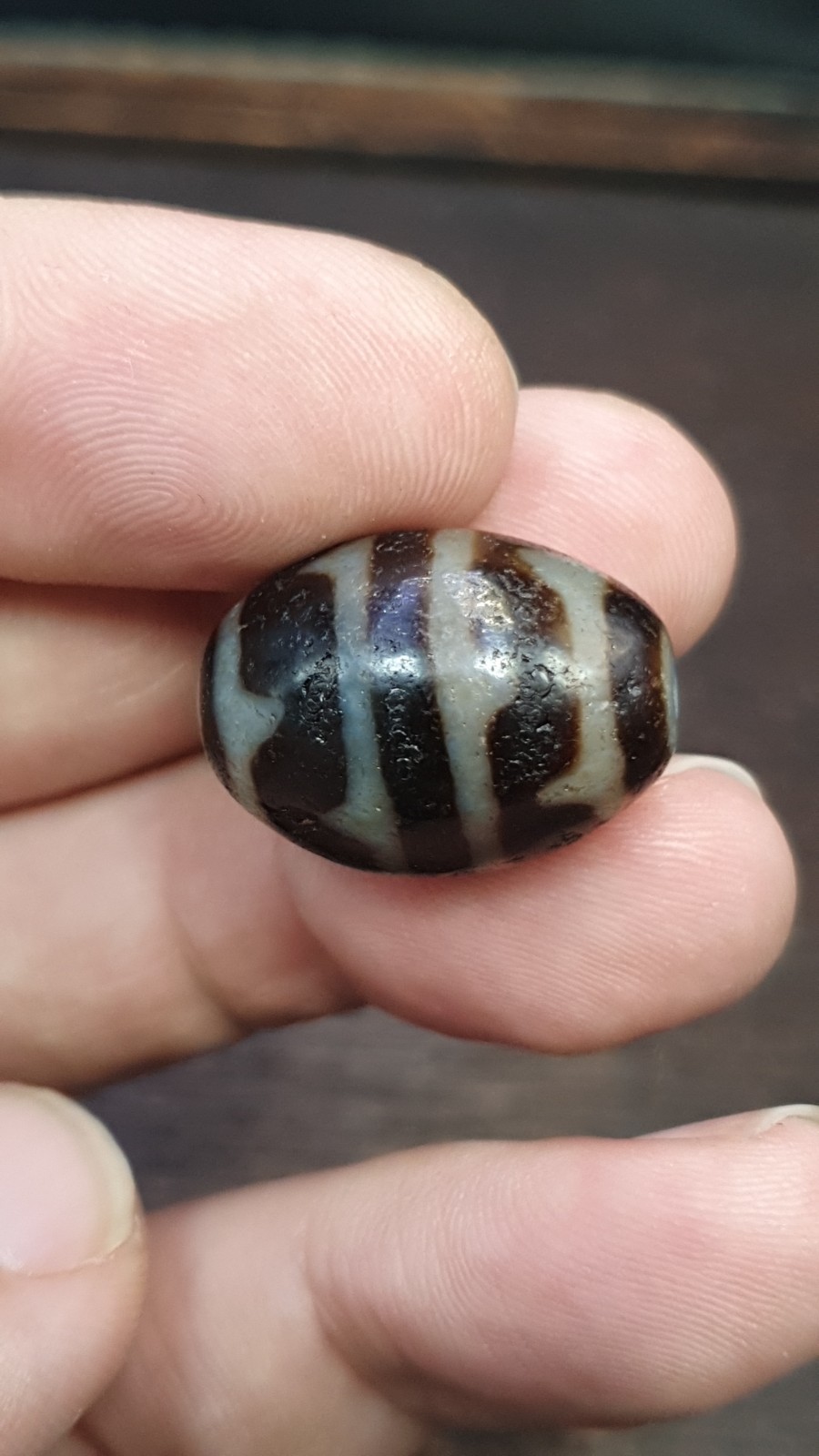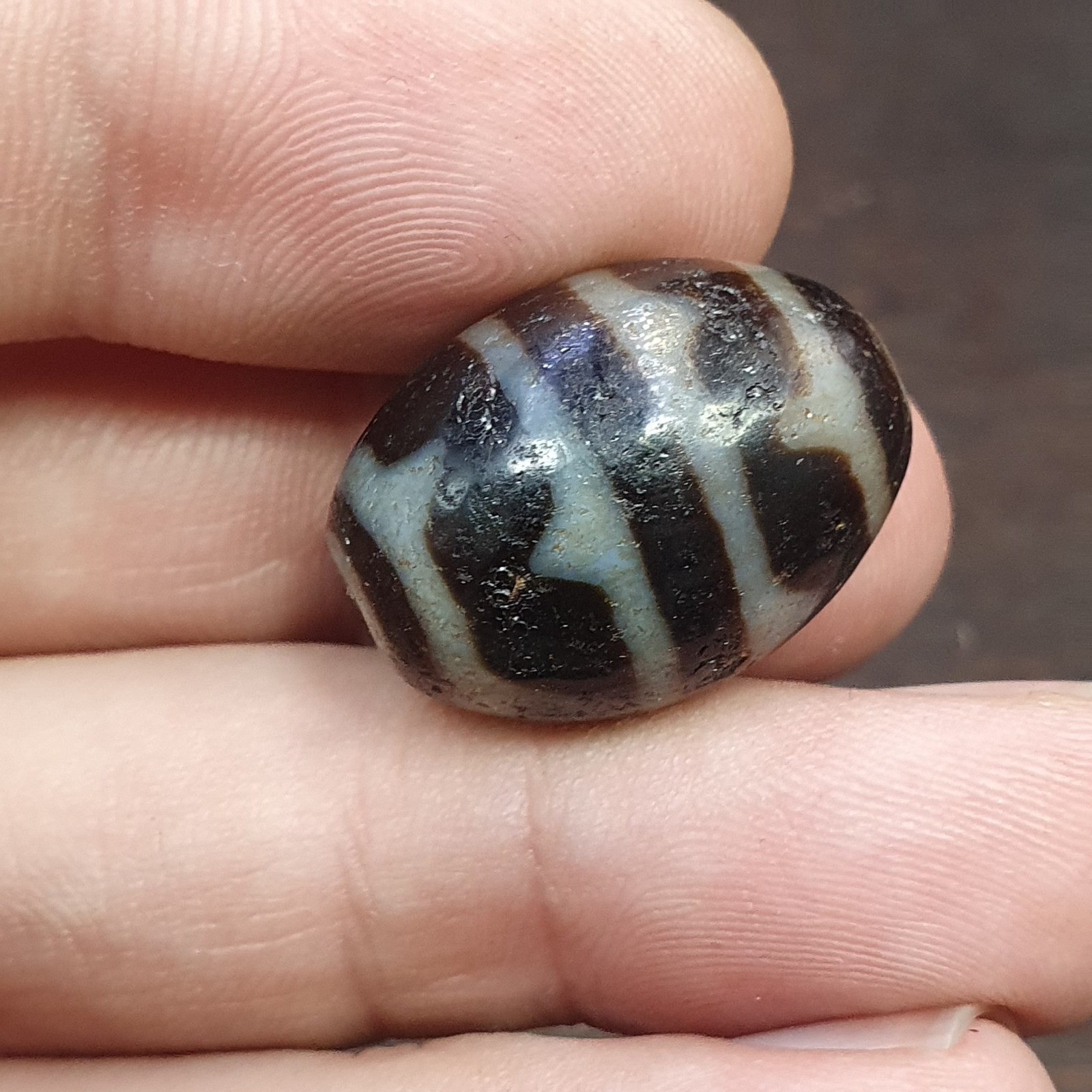Ancienne amulette indo tibetaine yeux lignes fleches motif pierre agate dzi perle