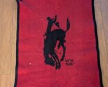 Una coperta di lana del centenario di 100 anni di Pendleton Let Er Buck Round Up in una forma rettangolare che misura 28 x 42 pollici. Presenta una combinazione di colori rosso e nero con un tema da cowboy occidentale. Realizzata negli Stati Uniti con materiale in lana, questa coperta originale di Pendleton e progettata per mostrare lo spirito del West americano.