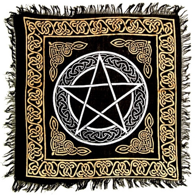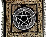 This lovely 100% rayon altar cloth features a central pentagram surrounded by Celtic knots. Gold and Silver on black, fringed, measures about 18 x 18 inches.